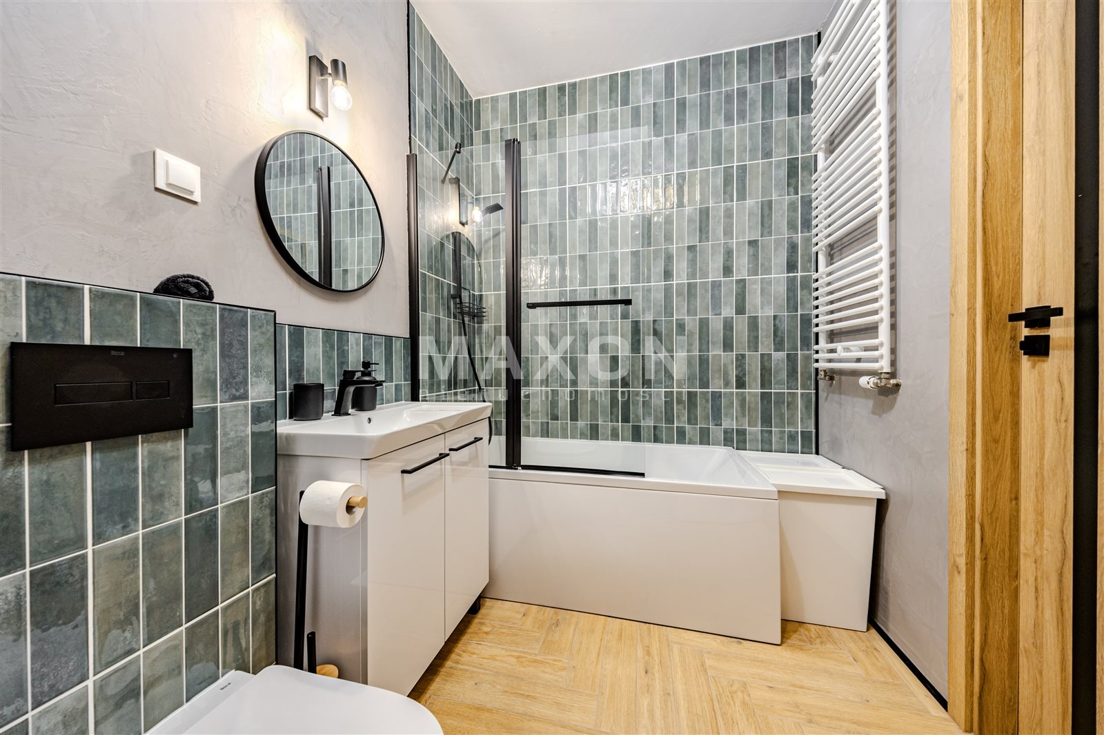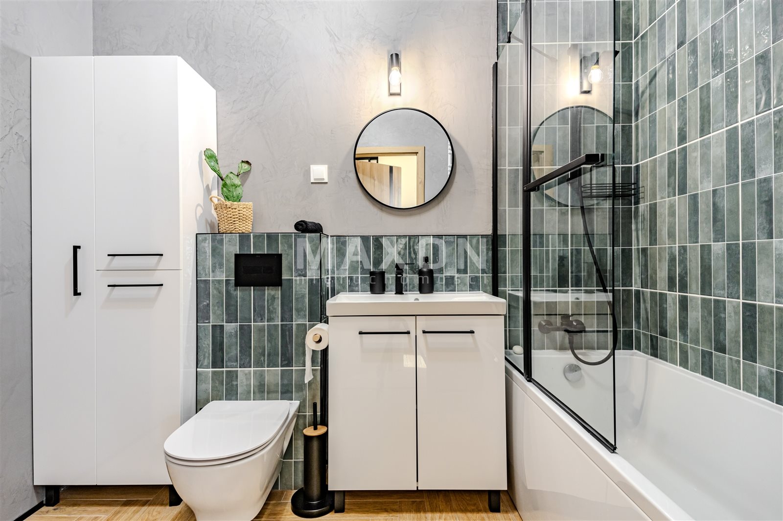 - Łazienka – ok. 5 m² z wanną, WC, umywalką 70 cm. Wykończona częściowo w płytkach ceramicznych, częściowo w nowoczesnym mikrocemencie.