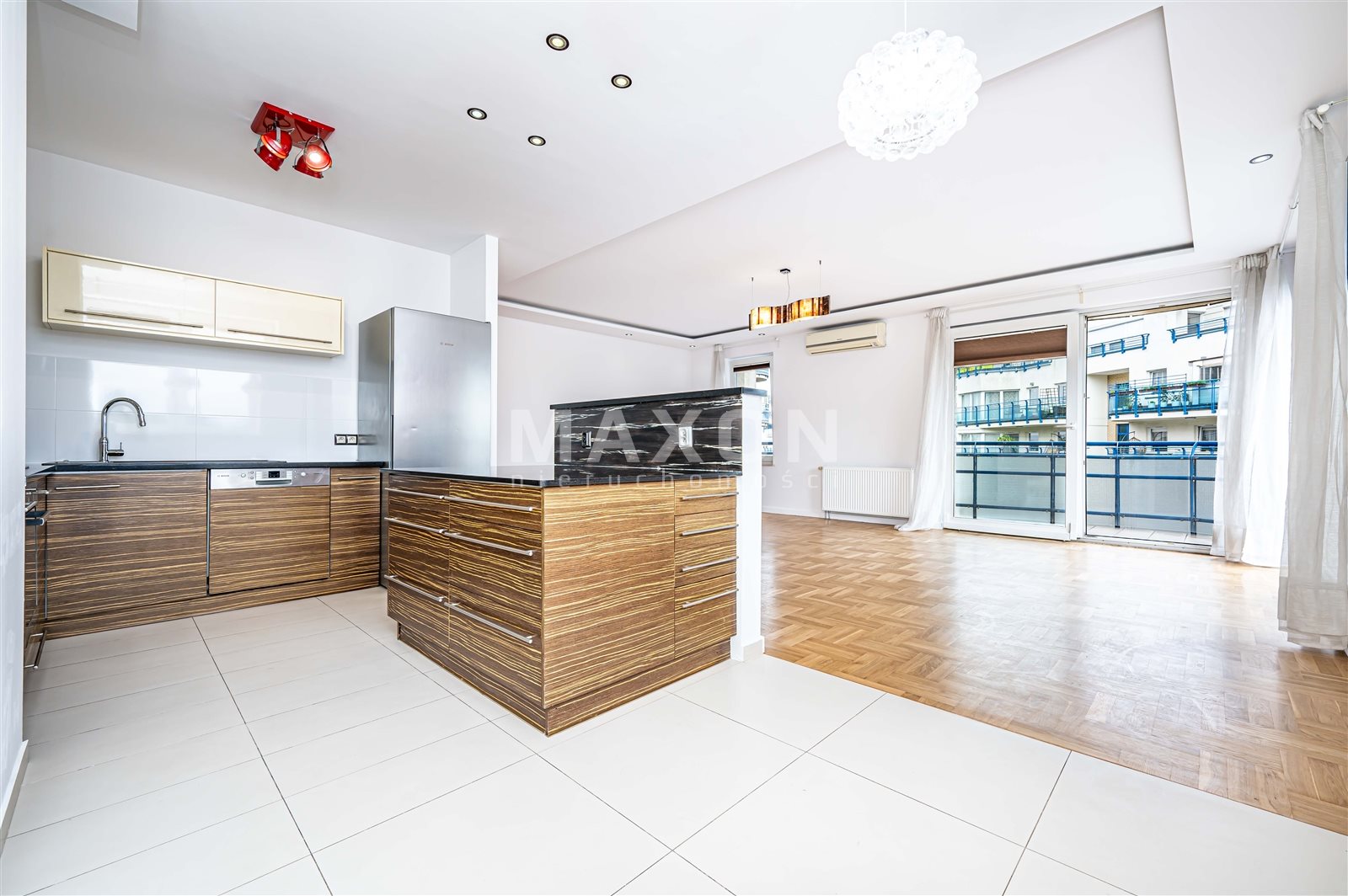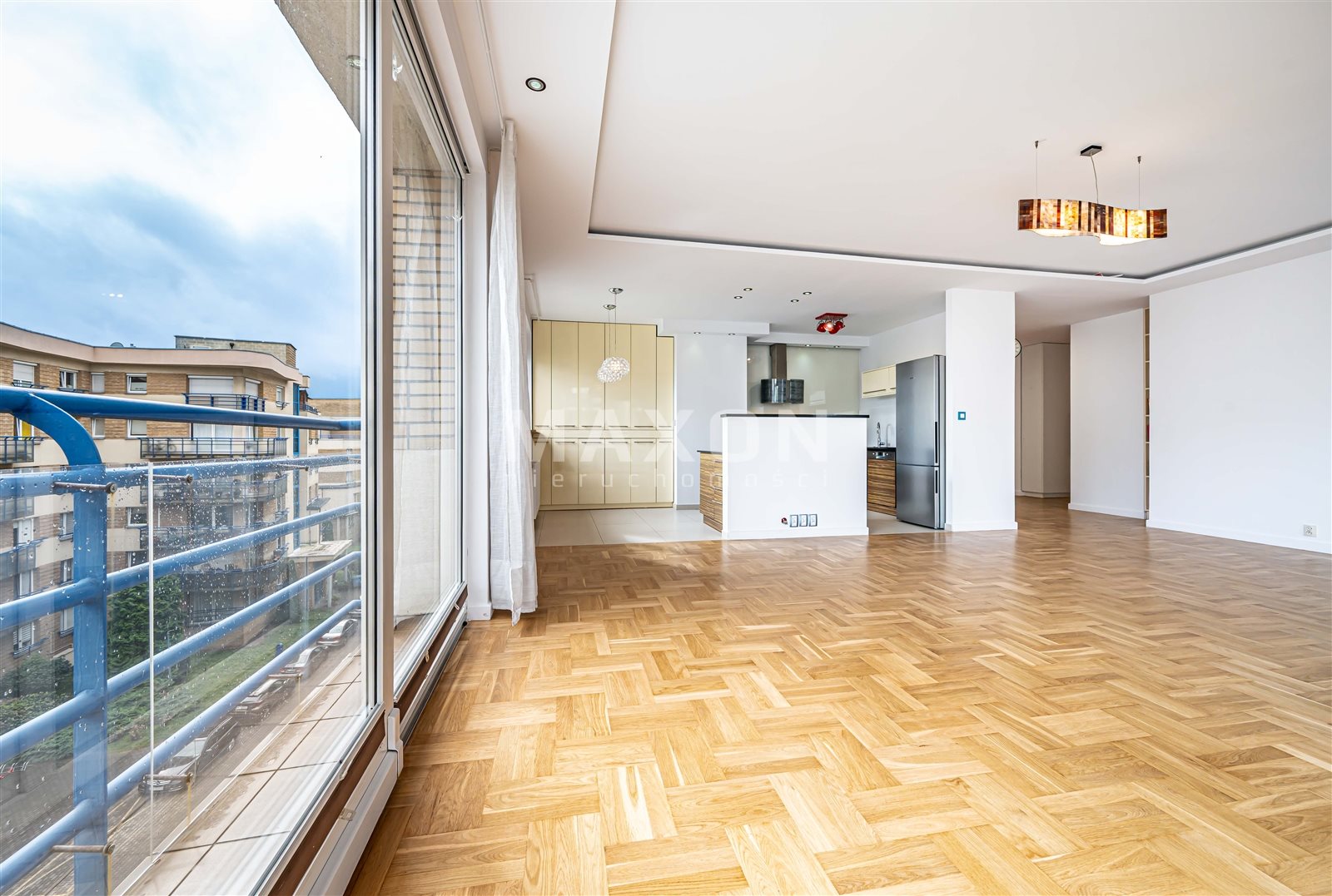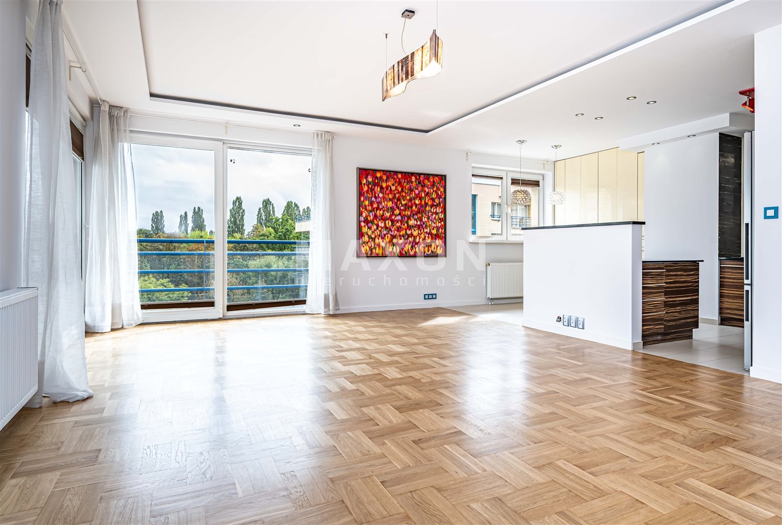 - salon z panoramicznymi oknami, otwartą kuchnią i dużym tarasem z widokiem na Park Szczęśliwicki