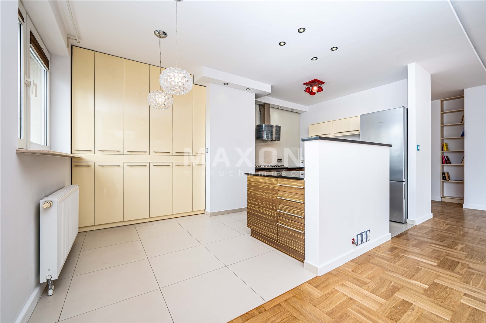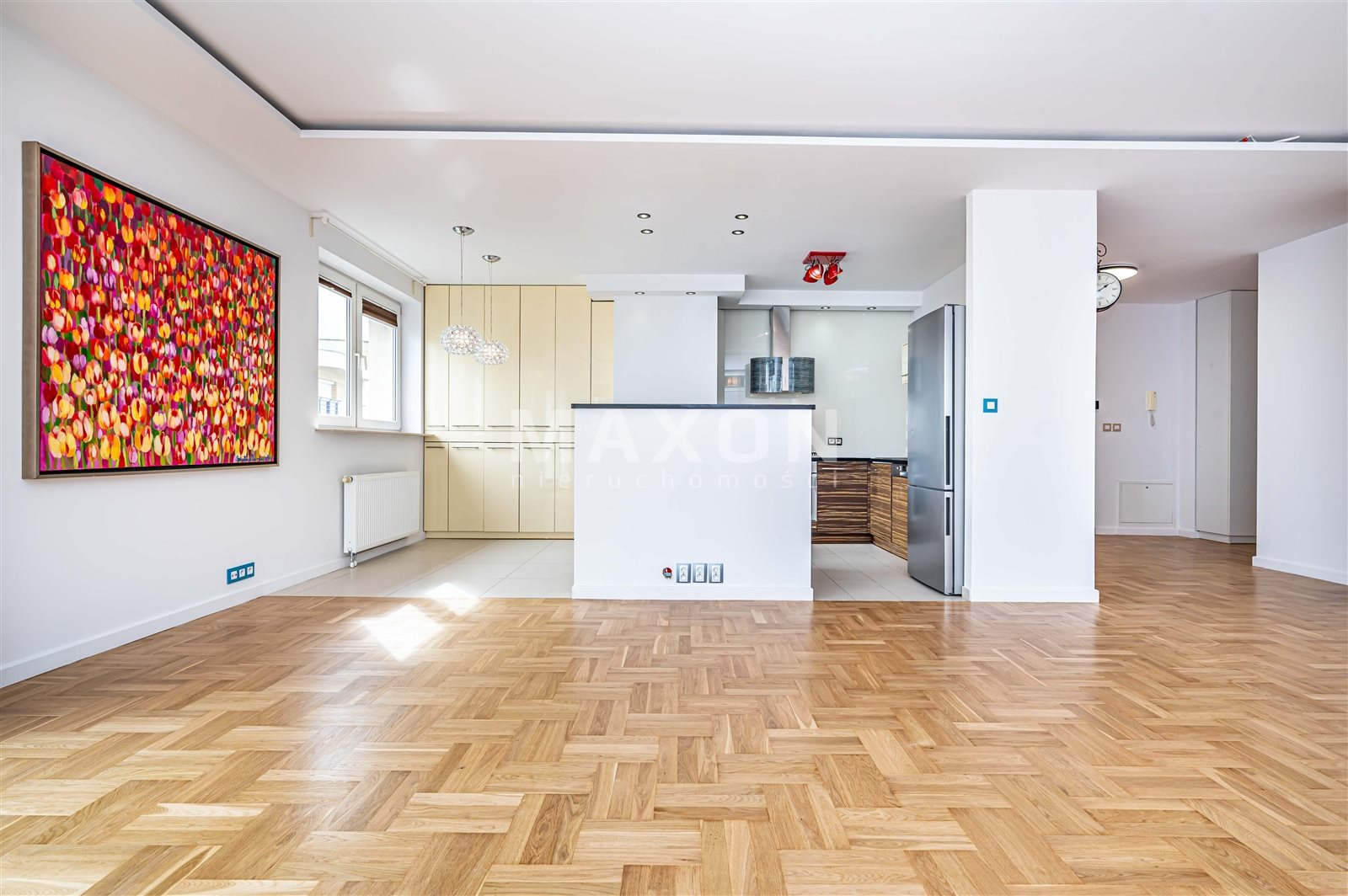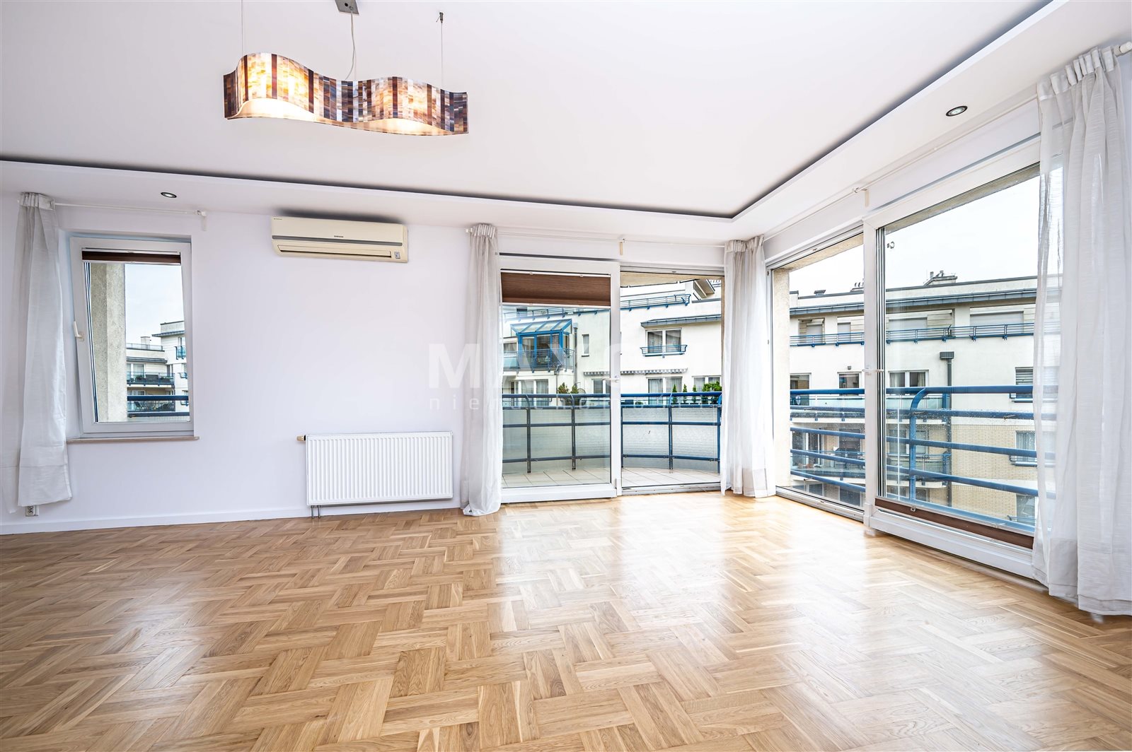 - salon z panoramicznymi oknami, otwartą kuchnią i dużym tarasem z widokiem na Park Szczęśliwicki