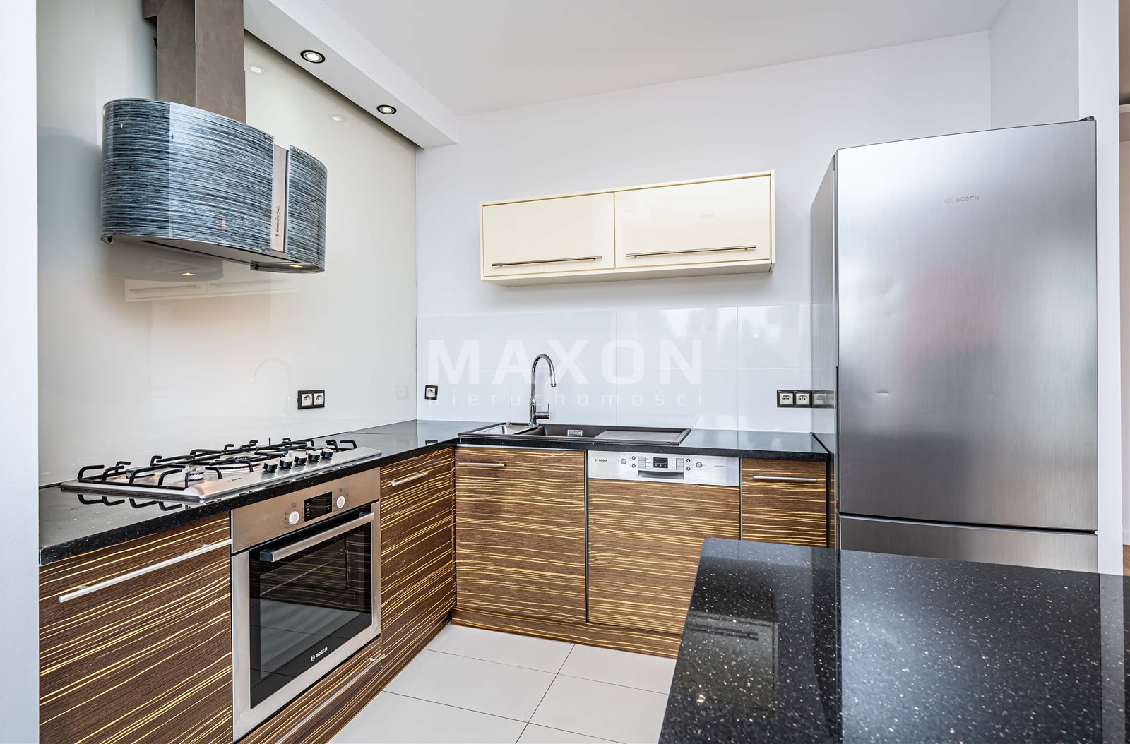 Kuchnia z wyspą wyposażona w liczne miejsca do przechowywania, sprzęty AGD, a także oryginalny okap kuchenny.