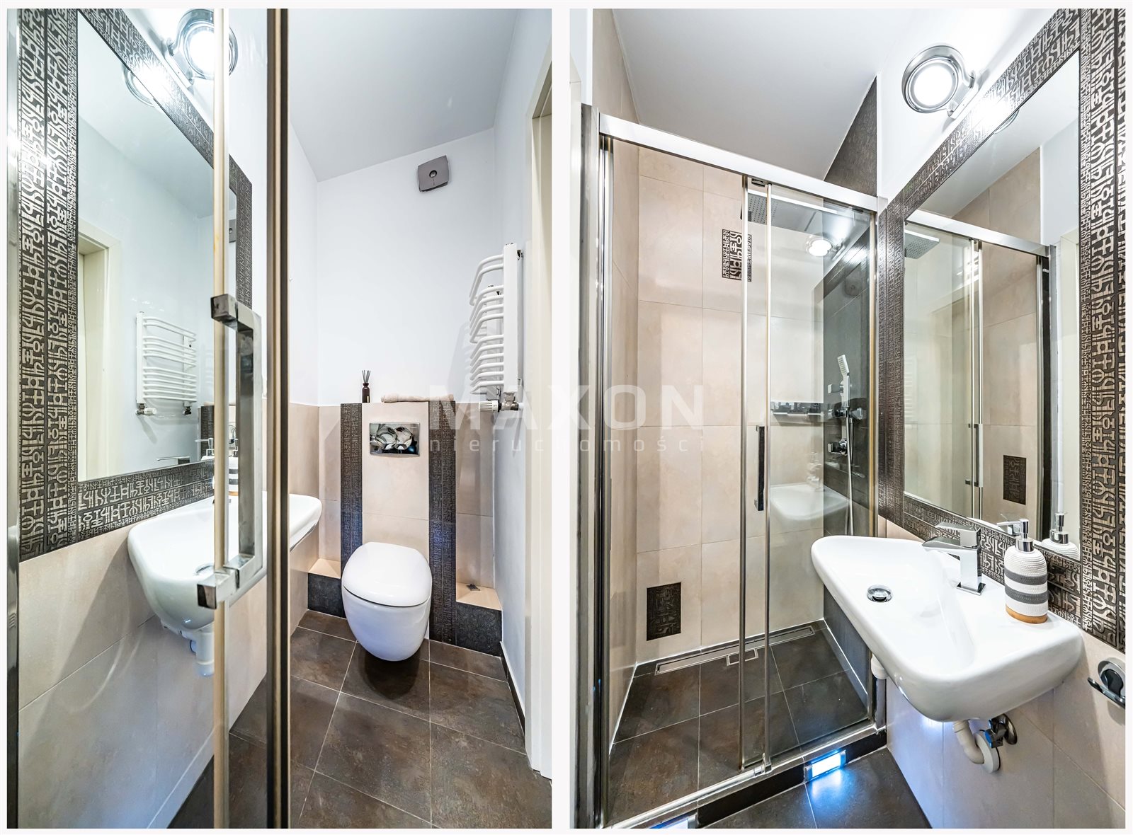 W obydwu łazienkach zastosowano spokojne, stonowane kolory.
