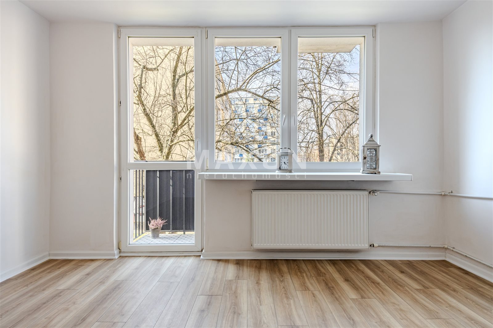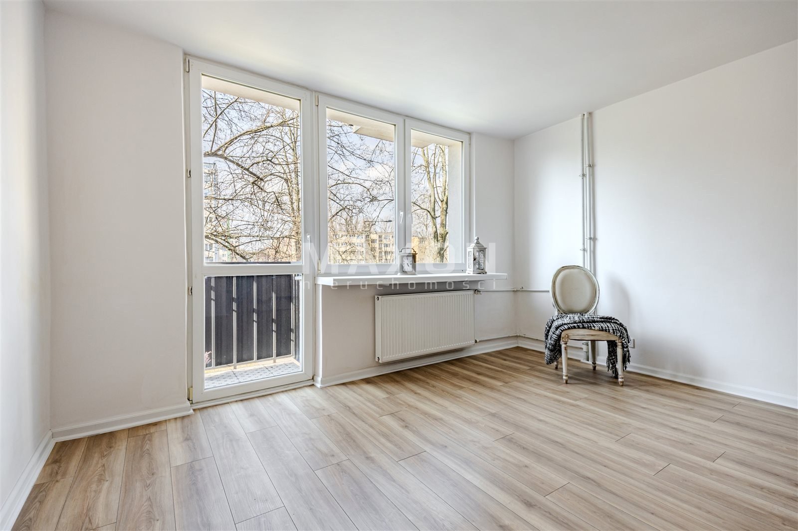 Mieszkanie składa się z dużego, ustawnego pokoju o kształcie kwadratu, z wyjściem na balkon od strony zachodniej, co zapewnia świetne doświetlenie wnętrza przez większą część dnia.