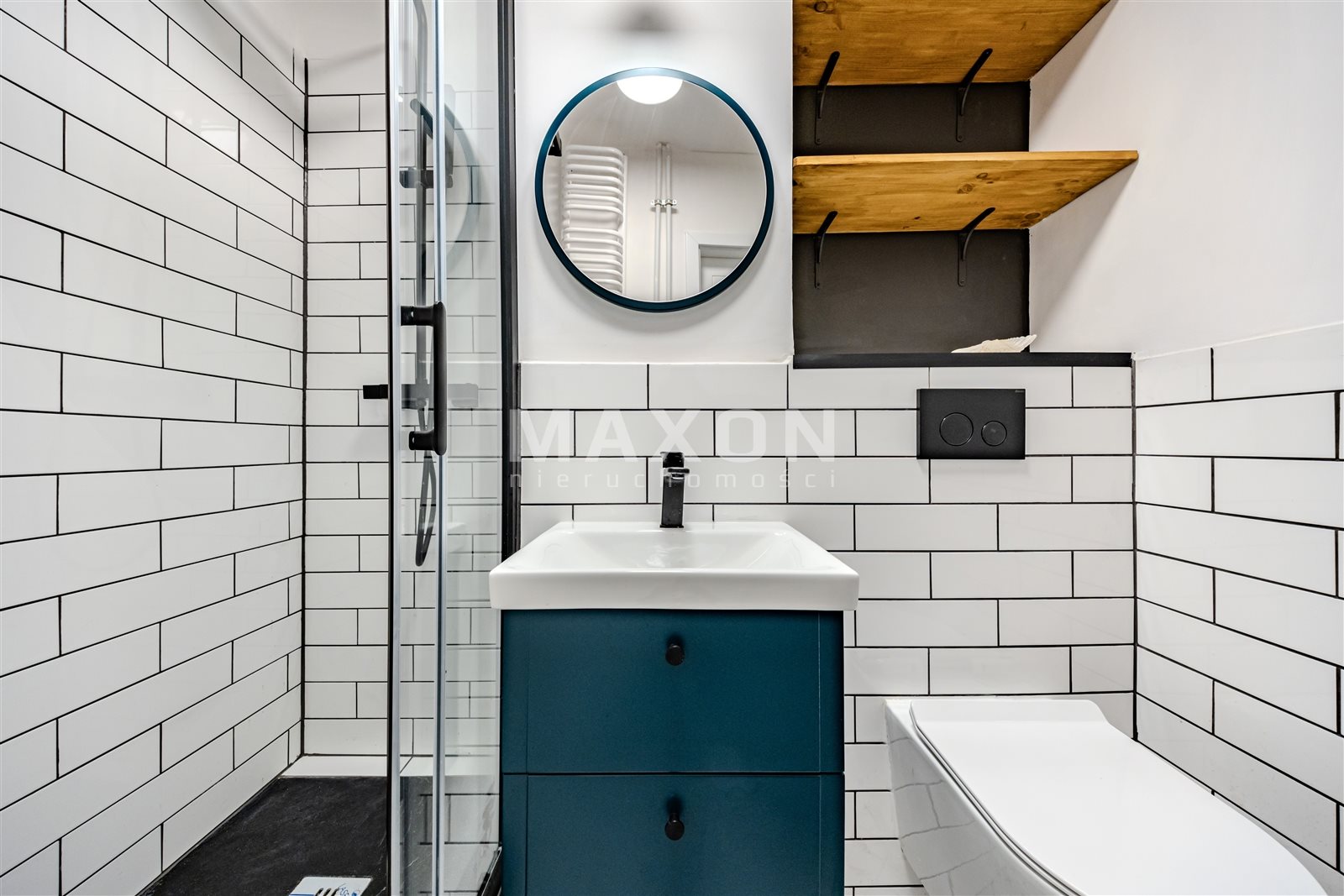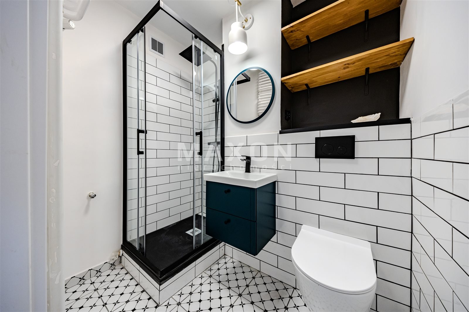 Łazienka przeszła całkowity remont – została wykończona w nowoczesnym stylu, w eleganckiej biało-czarnej kolorystyce.