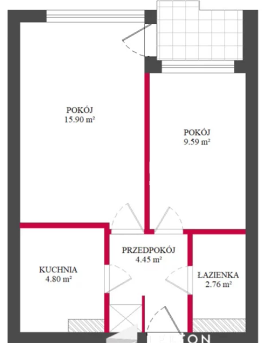 - ustawny salon z dużym oknem oraz wyjściem na balkon,