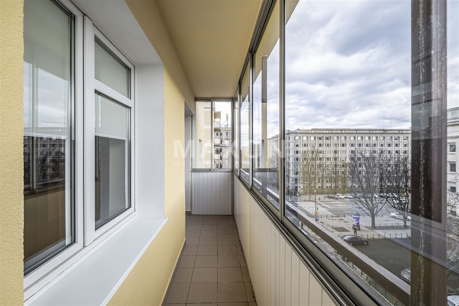 Z salonu i sypialni można wyjść na długi, oszklony balkon.