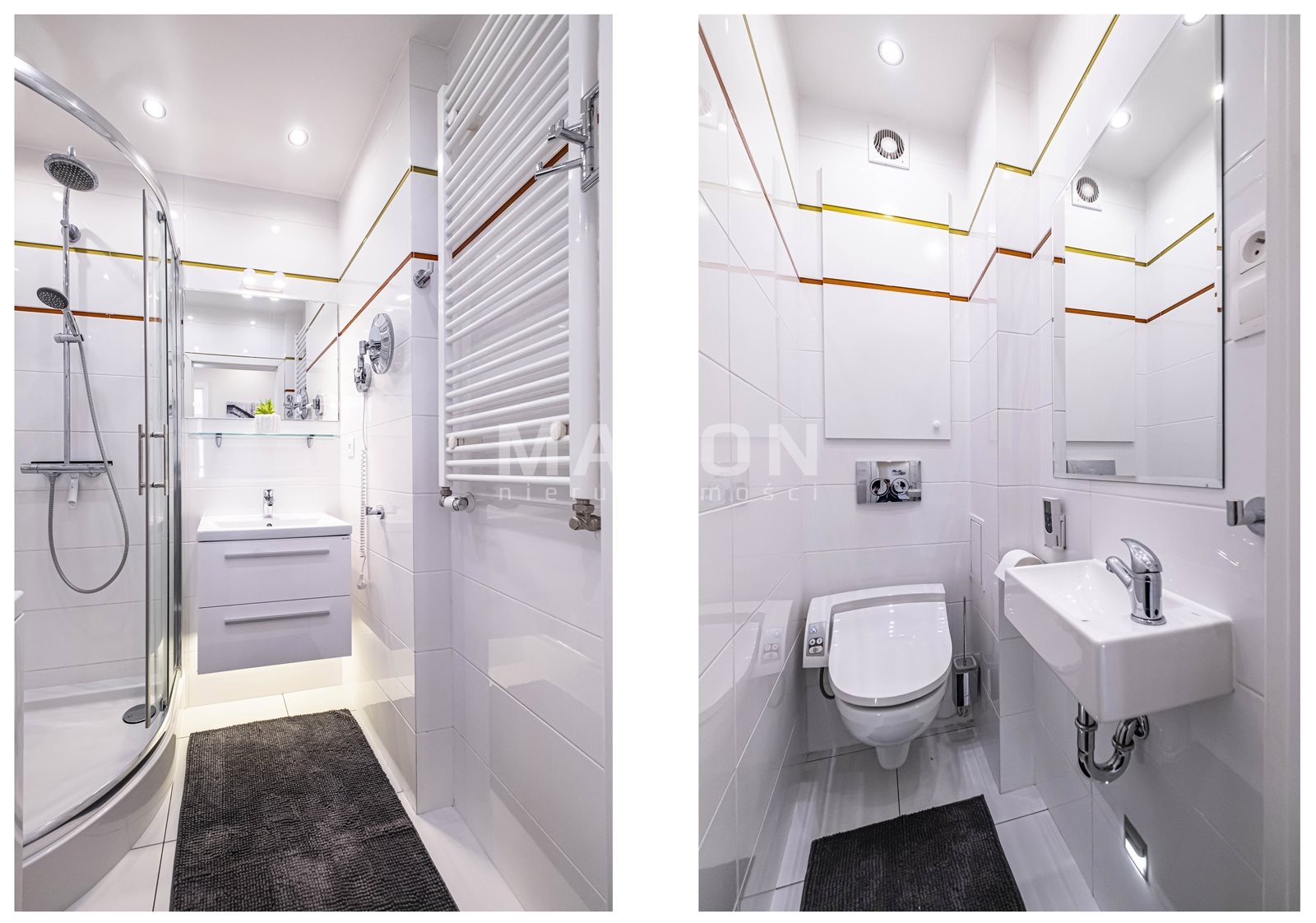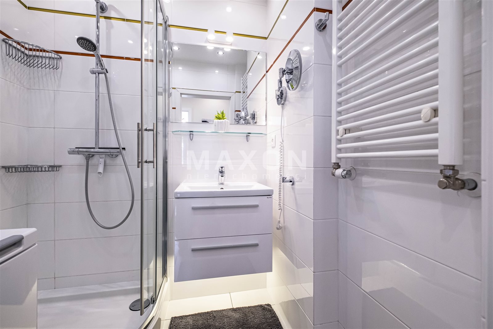 *łazienka z prysznicem i pralką,