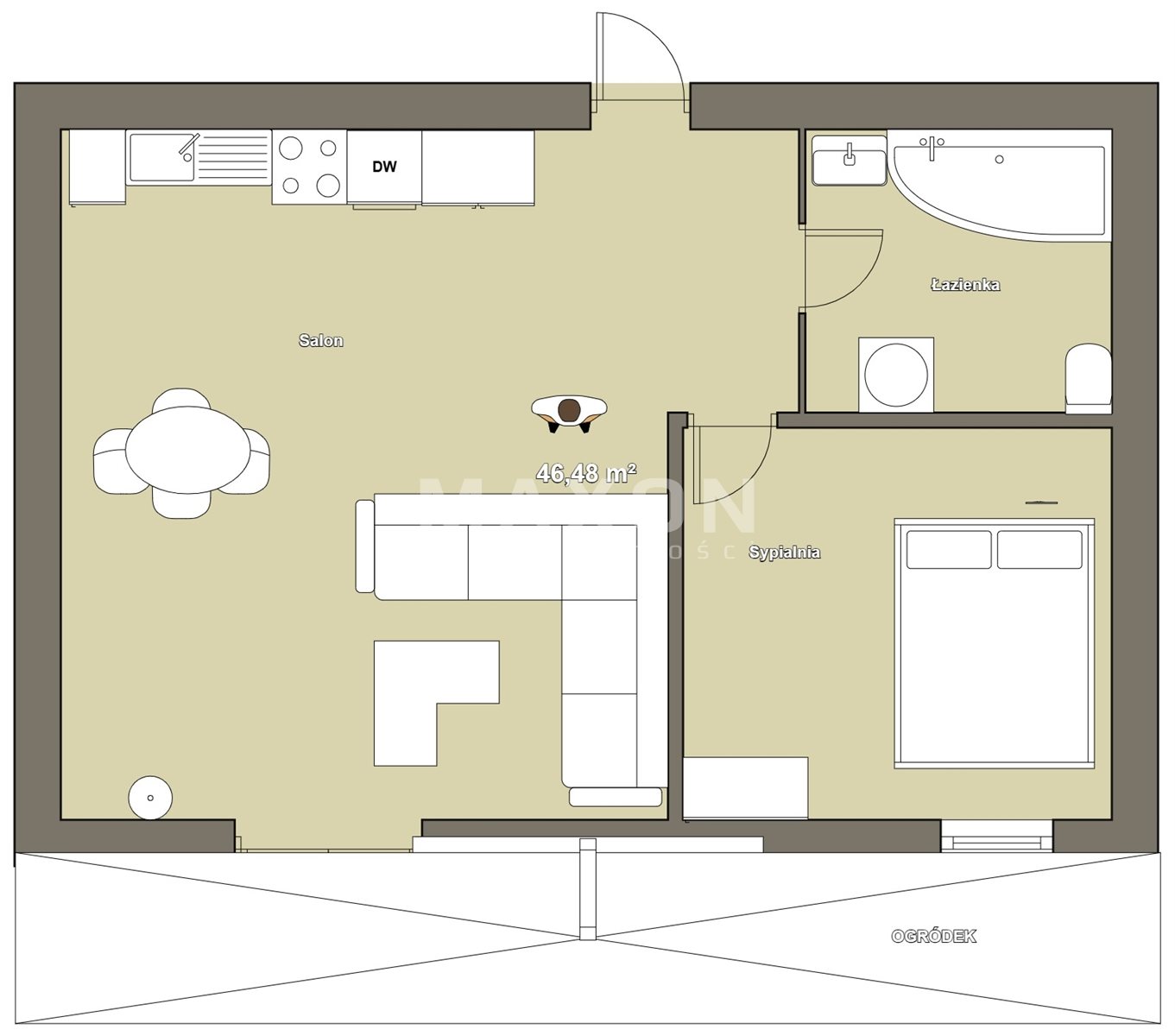 Mieszkanie zostało zaprojektowane z myślą o maksymalnym komforcie użytkowania – ergonomiczny układ pomieszczeń pozwala na swobodną aranżację wnętrz, a duże przeszklenia zapewniają doskonałe doświetlenie. Z salonu znajduje się bezpośrednie wyjście do ogródka, który stanowi idealne miejsce do wypoczynku lub stworzenia własnej strefy zieleni.