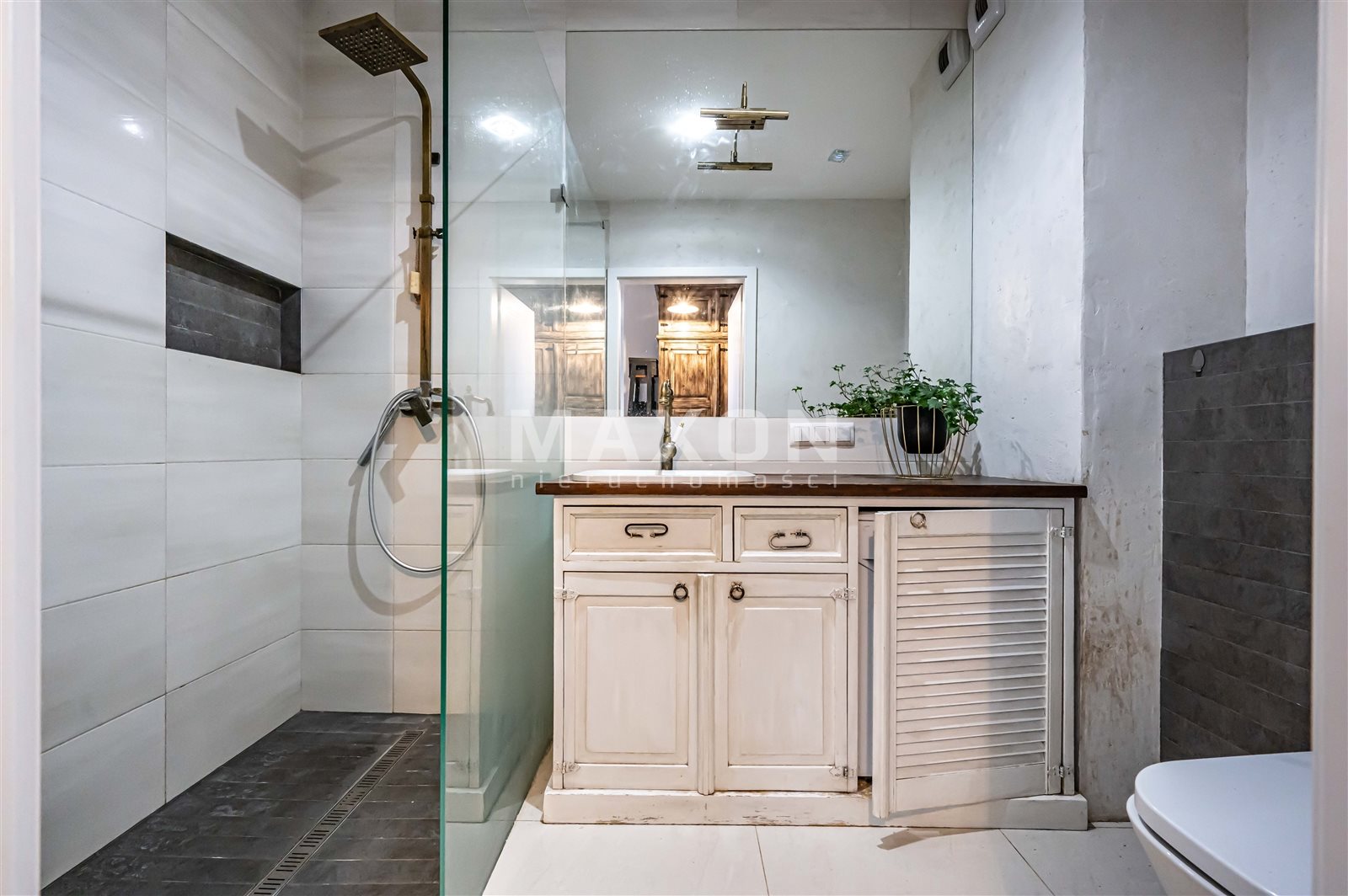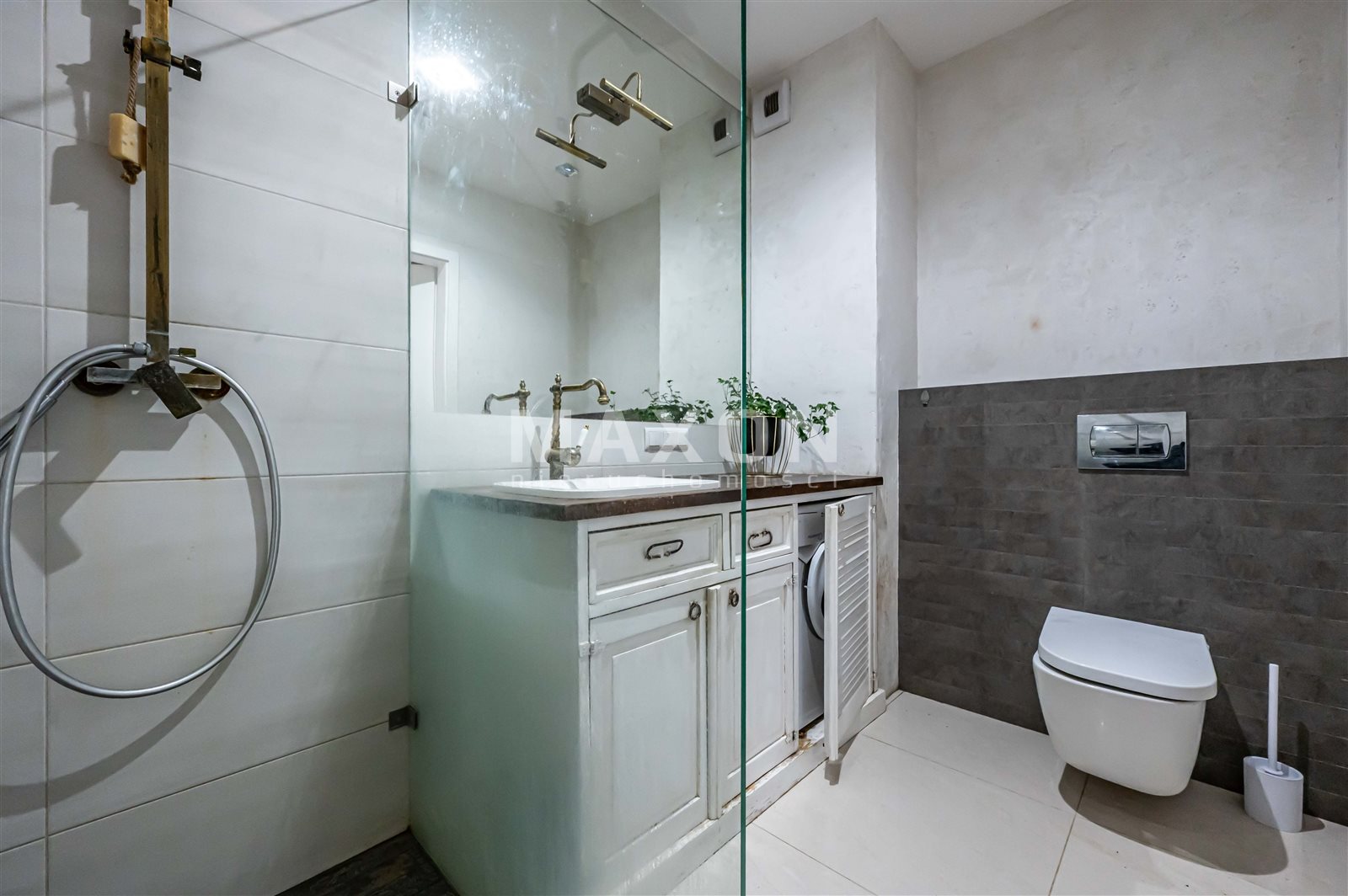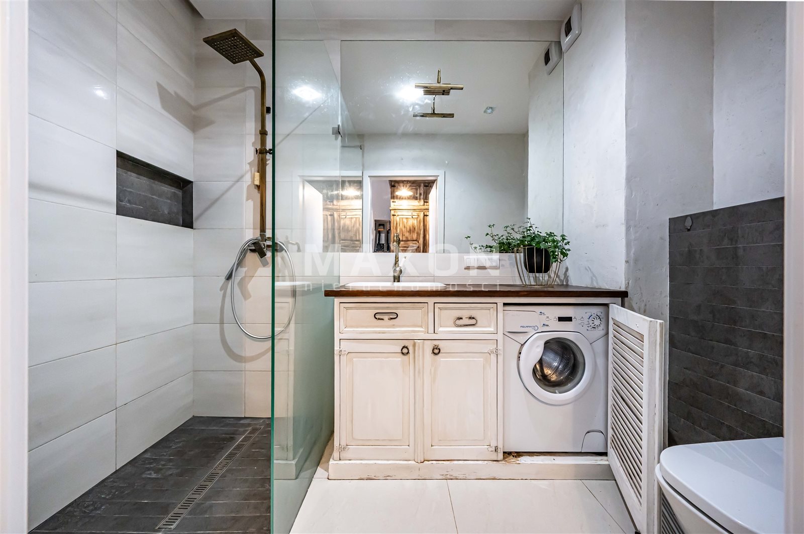 Łazienka z wygodnym, dużym prysznicem, mieszcząca sprzęt do prania w zabudowie stolarskiej.