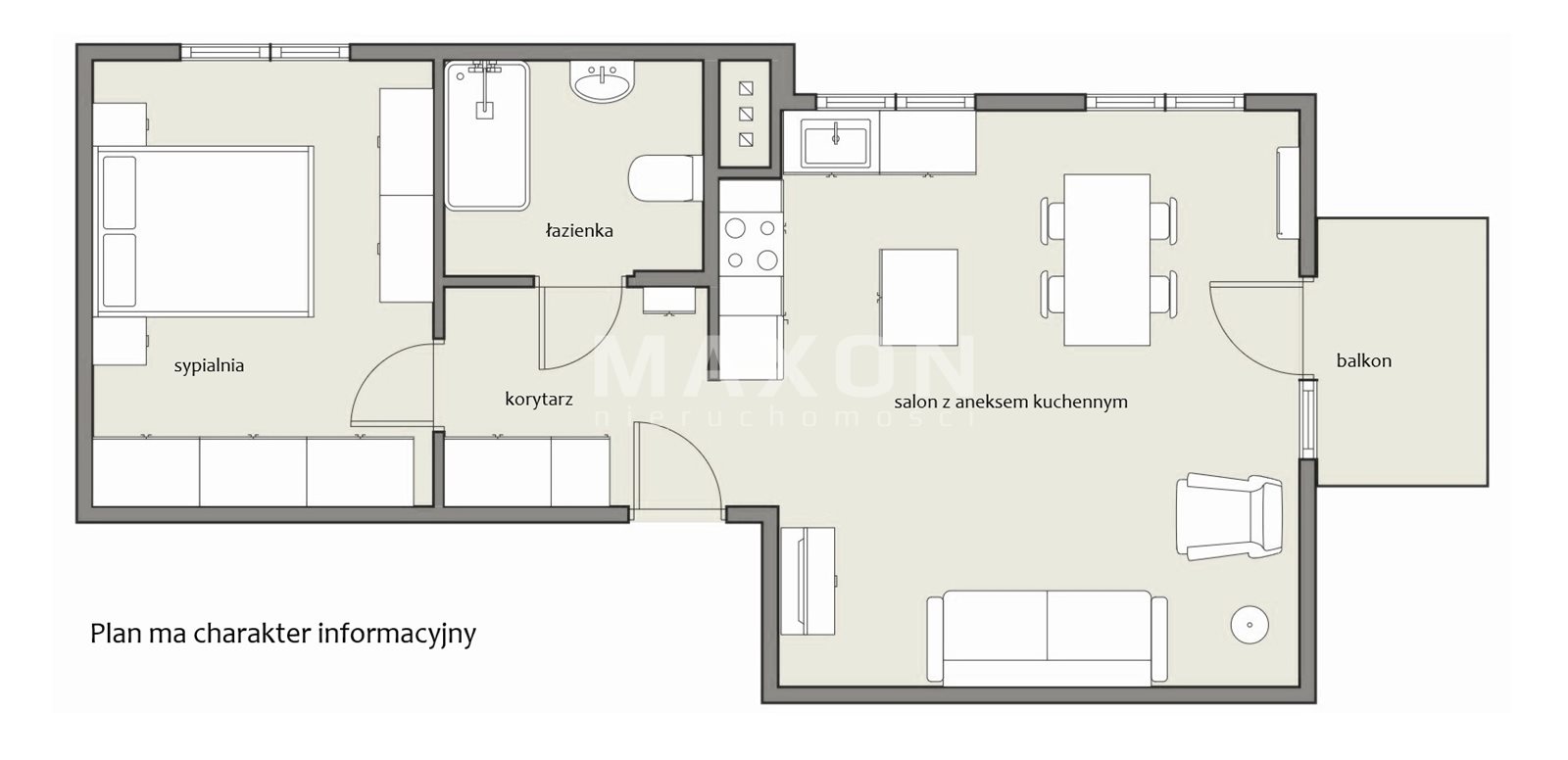 - salon z aneksem kuchennym i wyjściem na balkon,