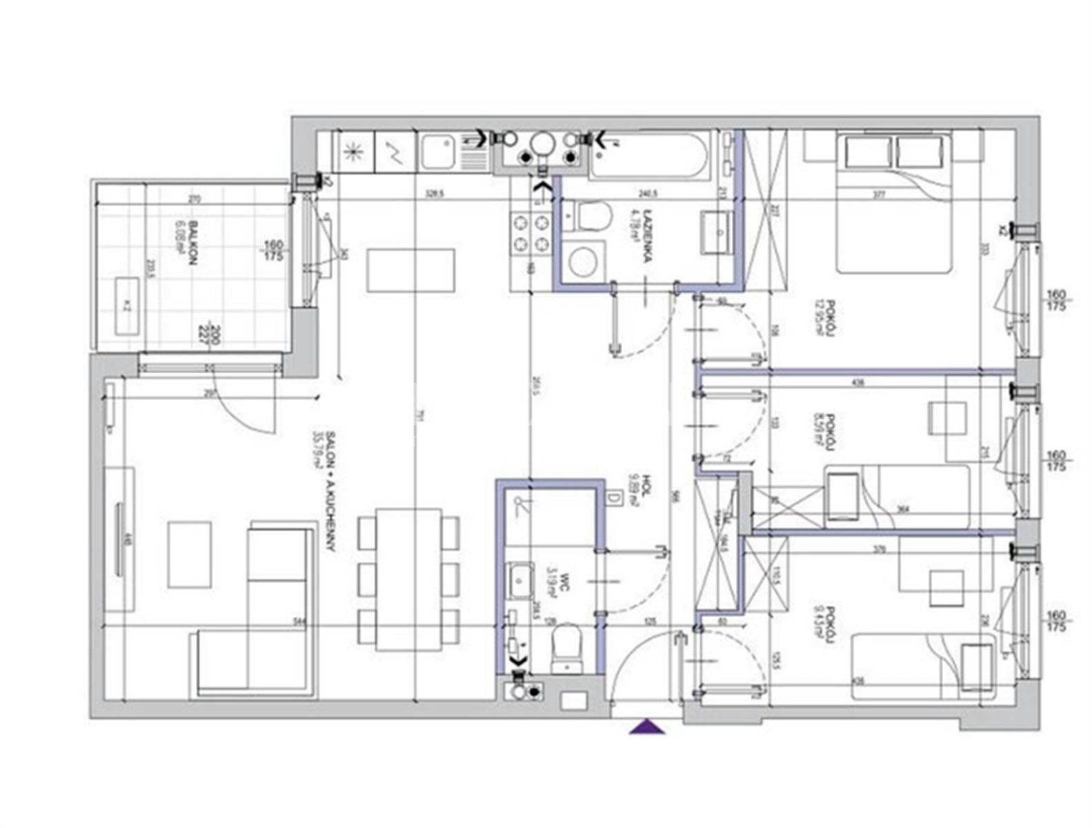 Powierzchnia to bardzo duży, ustawny salon z aneksem kuchennym, 3 pokoje, łazienka, oddzielne wc i przestronny balkon (6,08). Ekspozycja południowa i zachodnia – dzięki której mieszkanie jest jasne i pełne naturalnego światła.