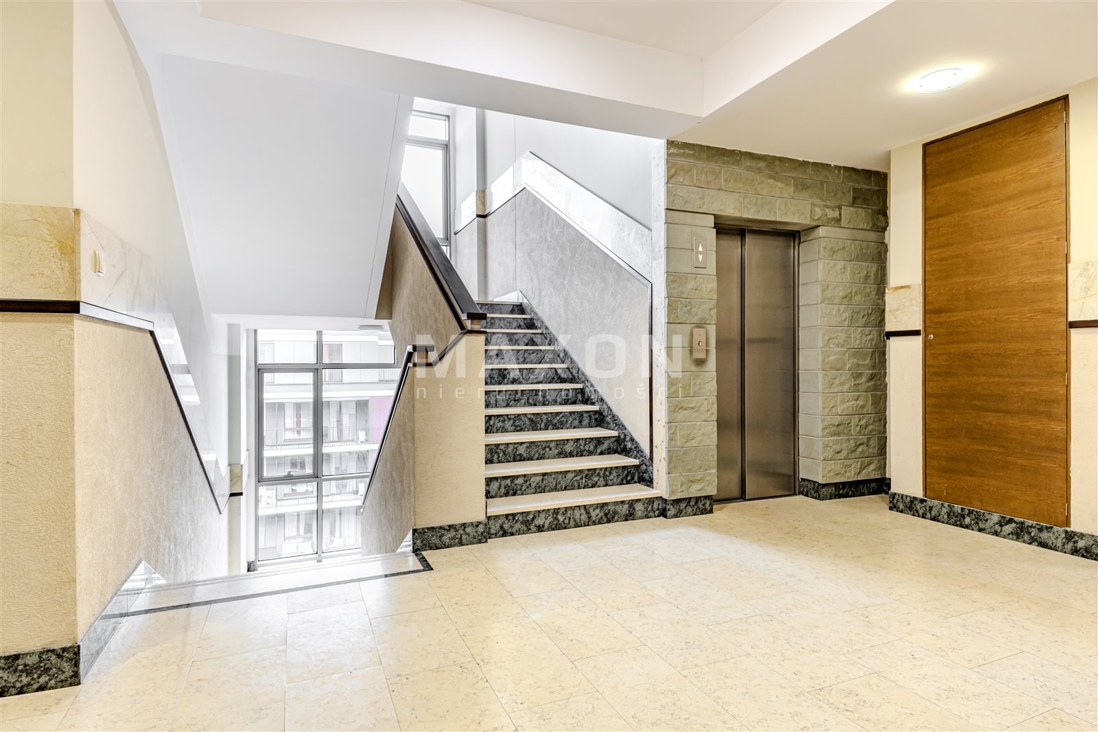 Przestronny korytarz ze szlachetnymi wykończeniami, nowoczesna winda