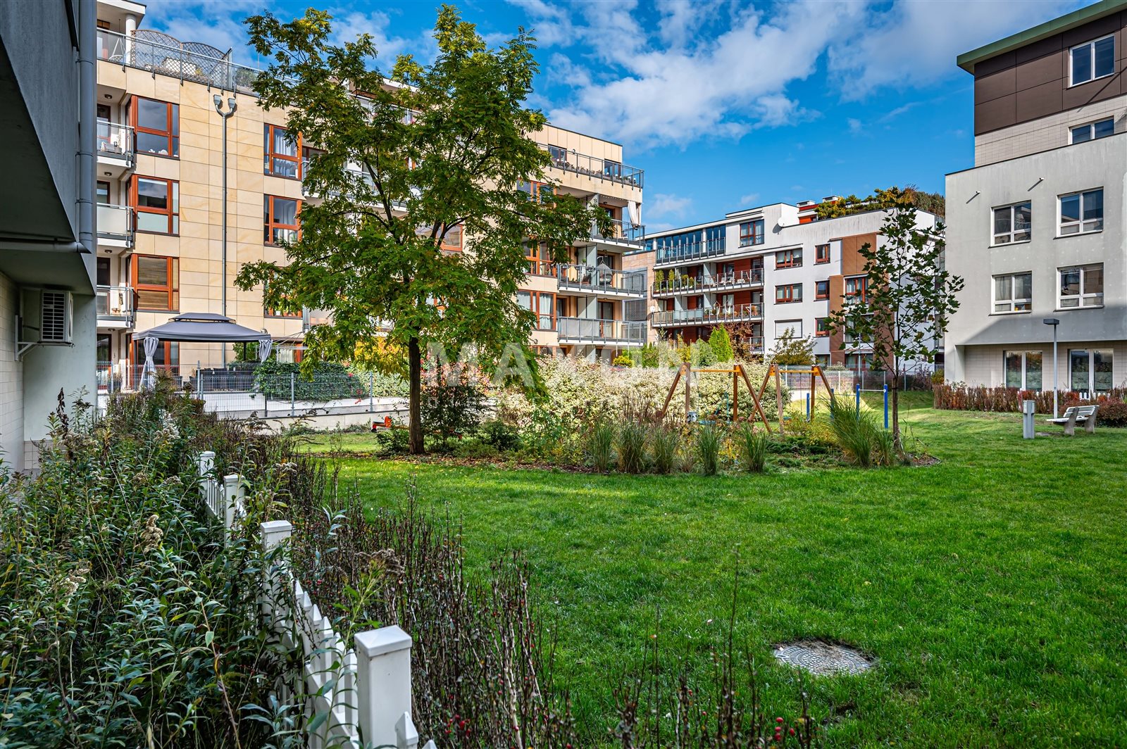 Osiedle o nowoczesnej i ponadczasowej architekturze, teren ogrodzony z wewnętrznym patio, placem zabaw dla dzieci.