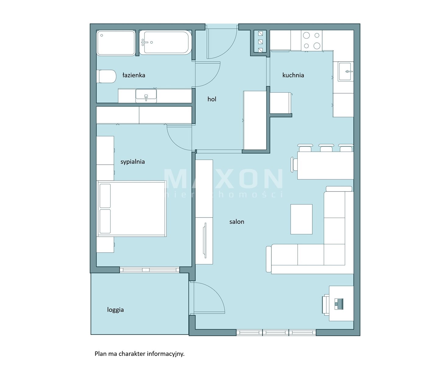 Rozkład apartamentu to: duży salon 37,2mkw połączony z jadalnią i kuchnią z wyjściem na zadaszoną loggię, ustawna sypialnia ok 13mkw, ponad 6mkw łazienka z wygodną kabiną prysznicową i wanną.