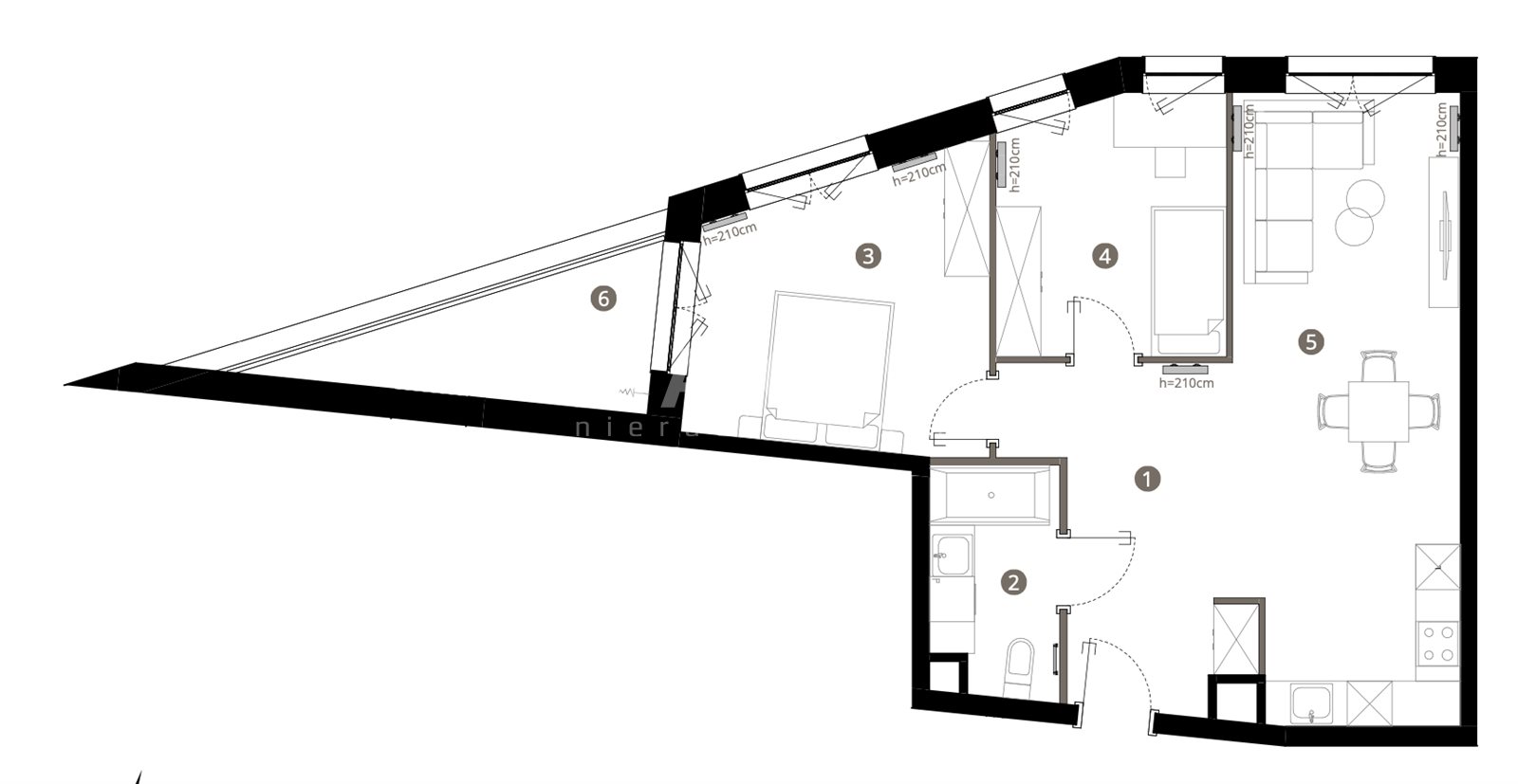 Powierzchnia mieszkania to duży, ustawny salon z aneksem kuchennym, 2 pokoje, łazienka, ogródek (6,41 mkw).