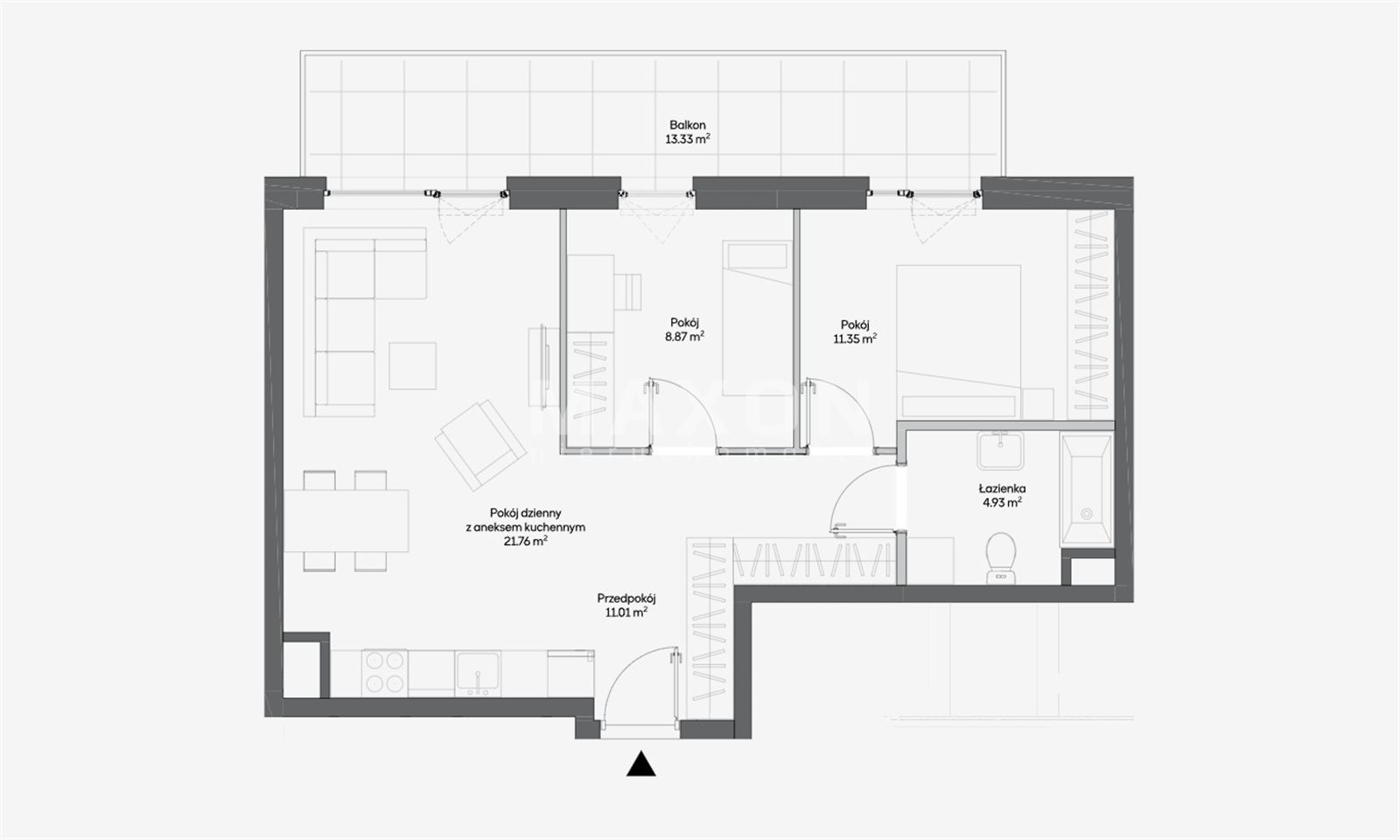 - Salon z aneksem kuchennym 21,76 mkw. z wyjściem na duży balkon 13,33 mkw.