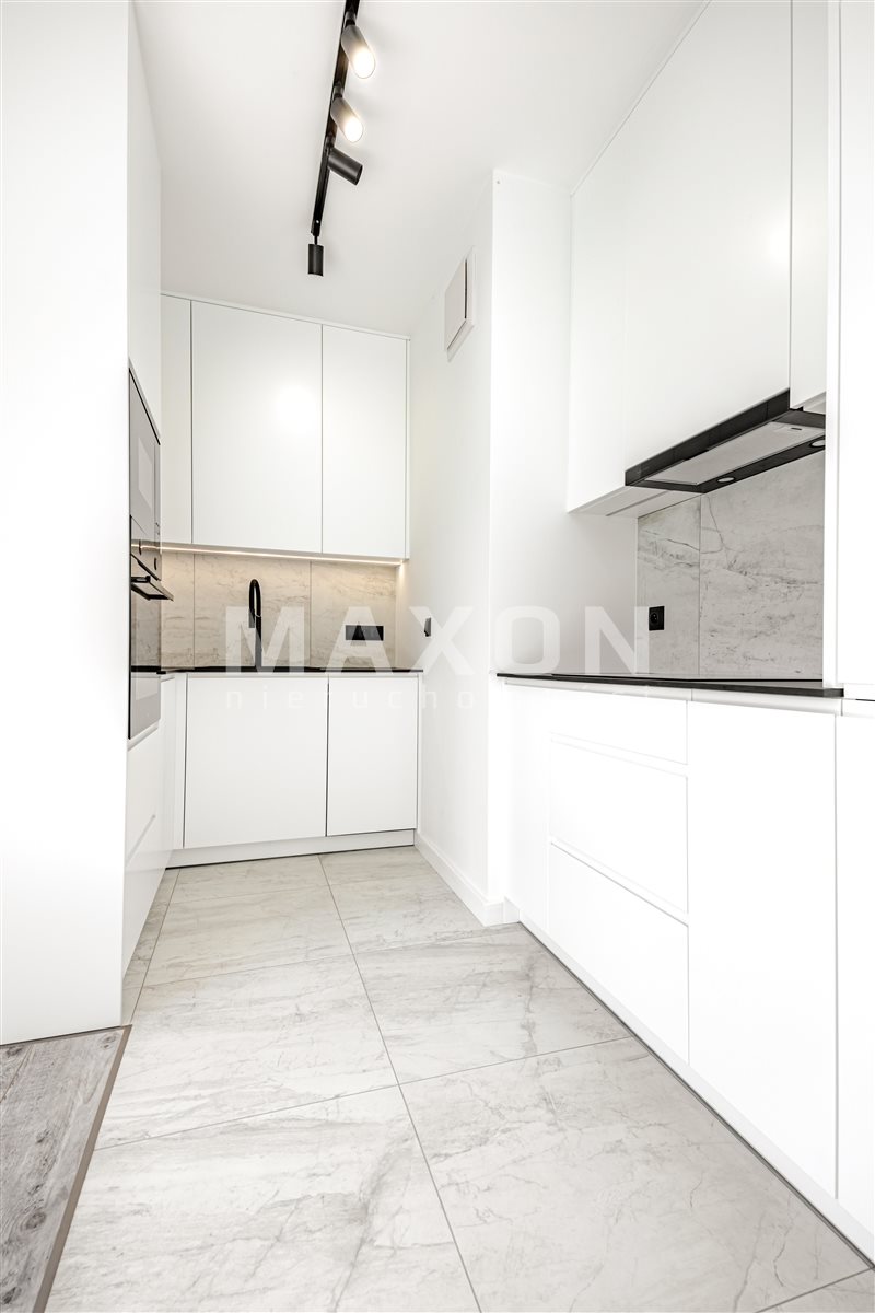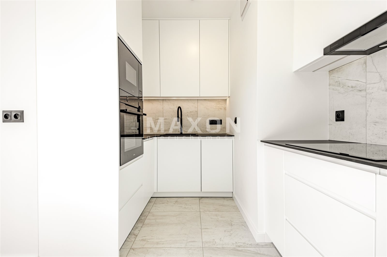 Kuchnia w zabudowie została wyposażona w sprzęt AGD. Jej ponadczasowa kolorystyka w połączeniu z eleganckim wykończeniem ścian podkreśla nowoczesny charakter wnętrza. Otwarty układ strefy dziennej zwiększa wygodę użytkowania i daje poczucie przestrzeni.