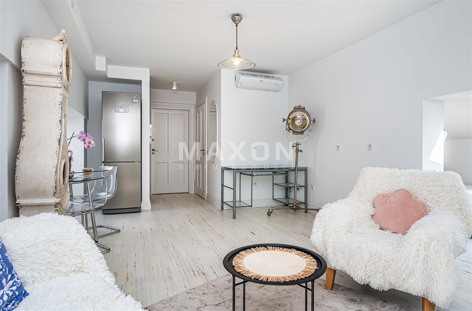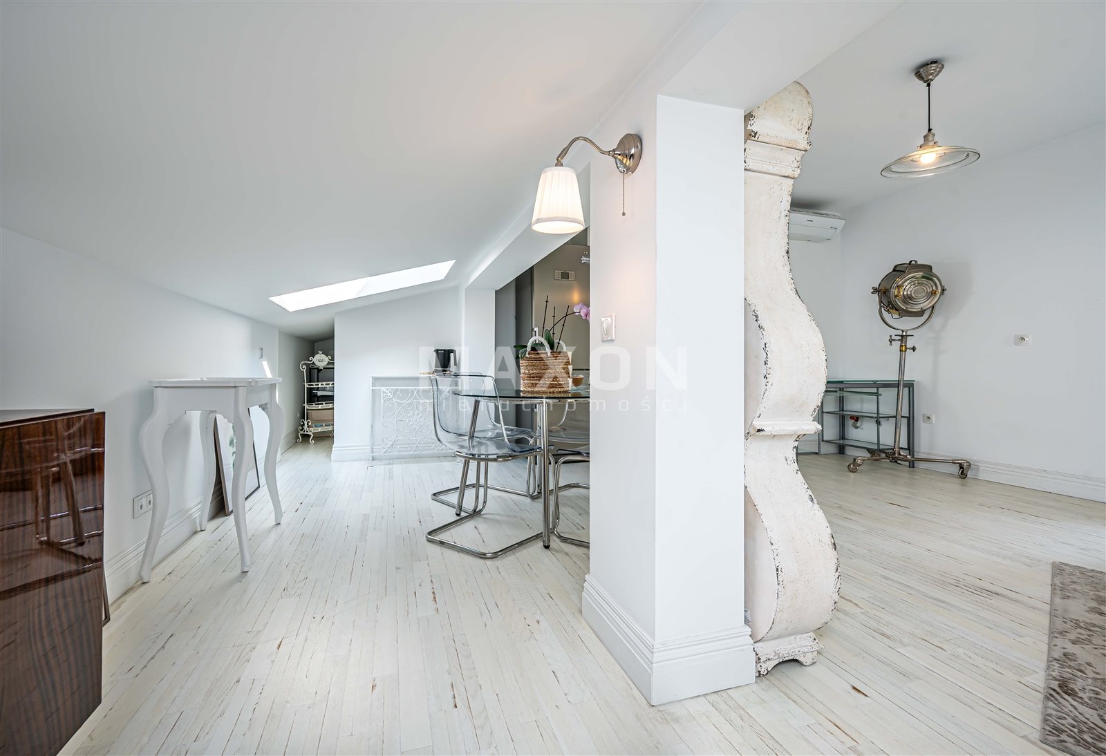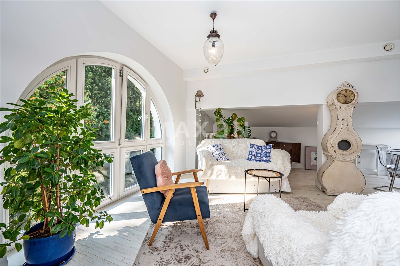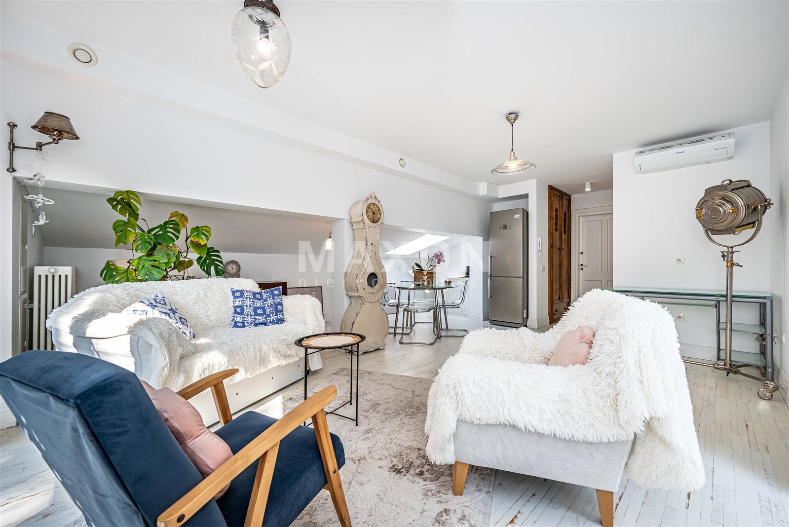 - pięknie doświetlonego salonu z rozkładaną kanapą , biurkiem do pracy, miejscem na wypoczynek oraz na aneks kuchenny o powierzchni ok. 17 m2,