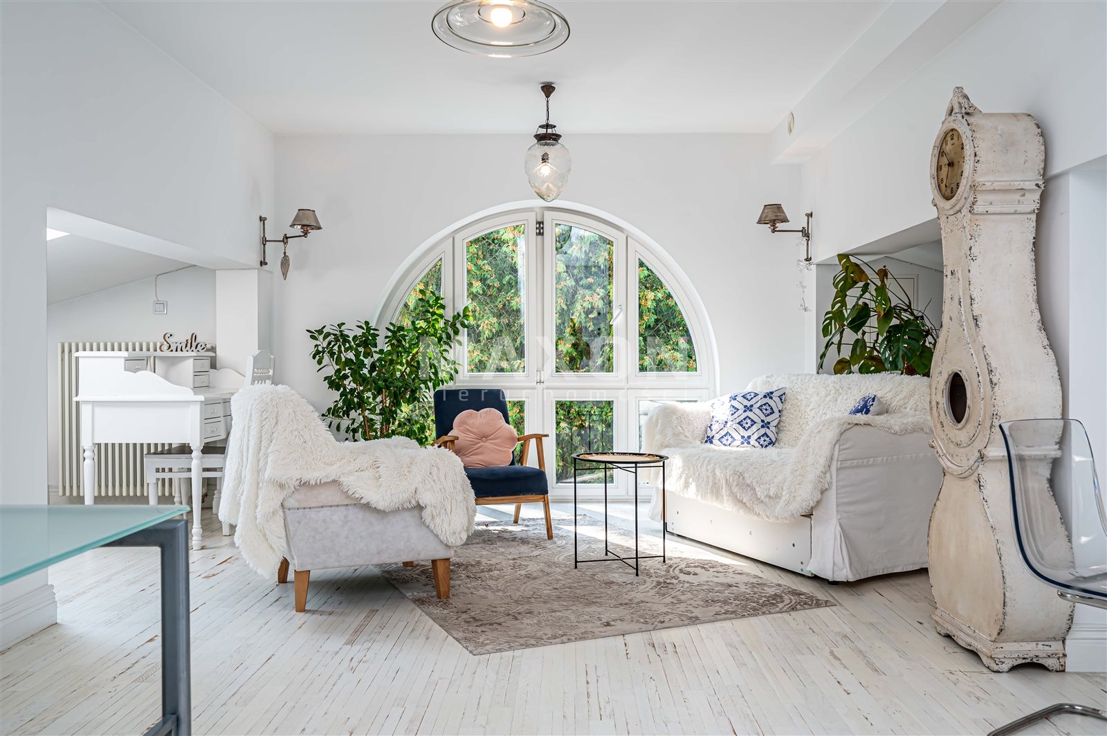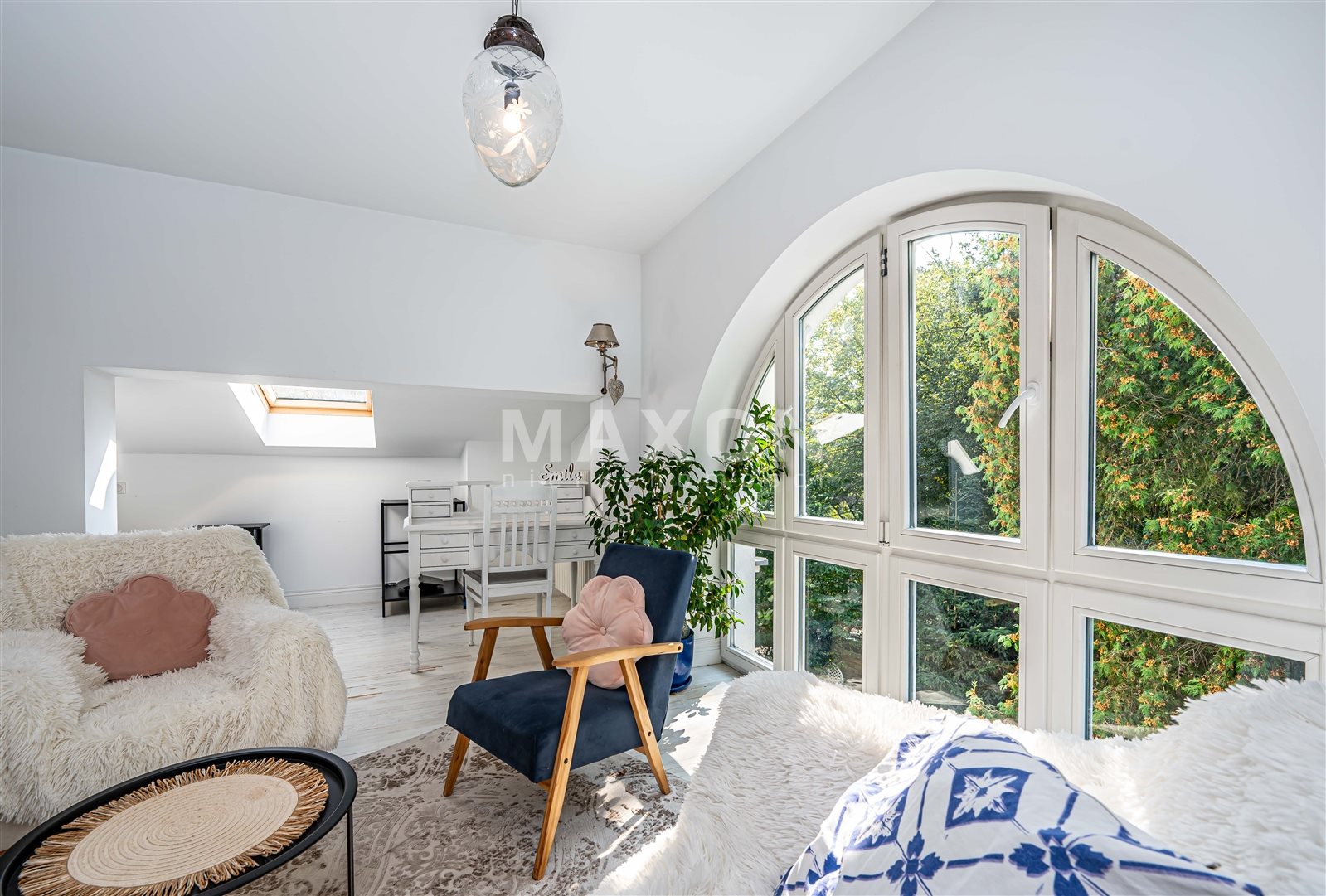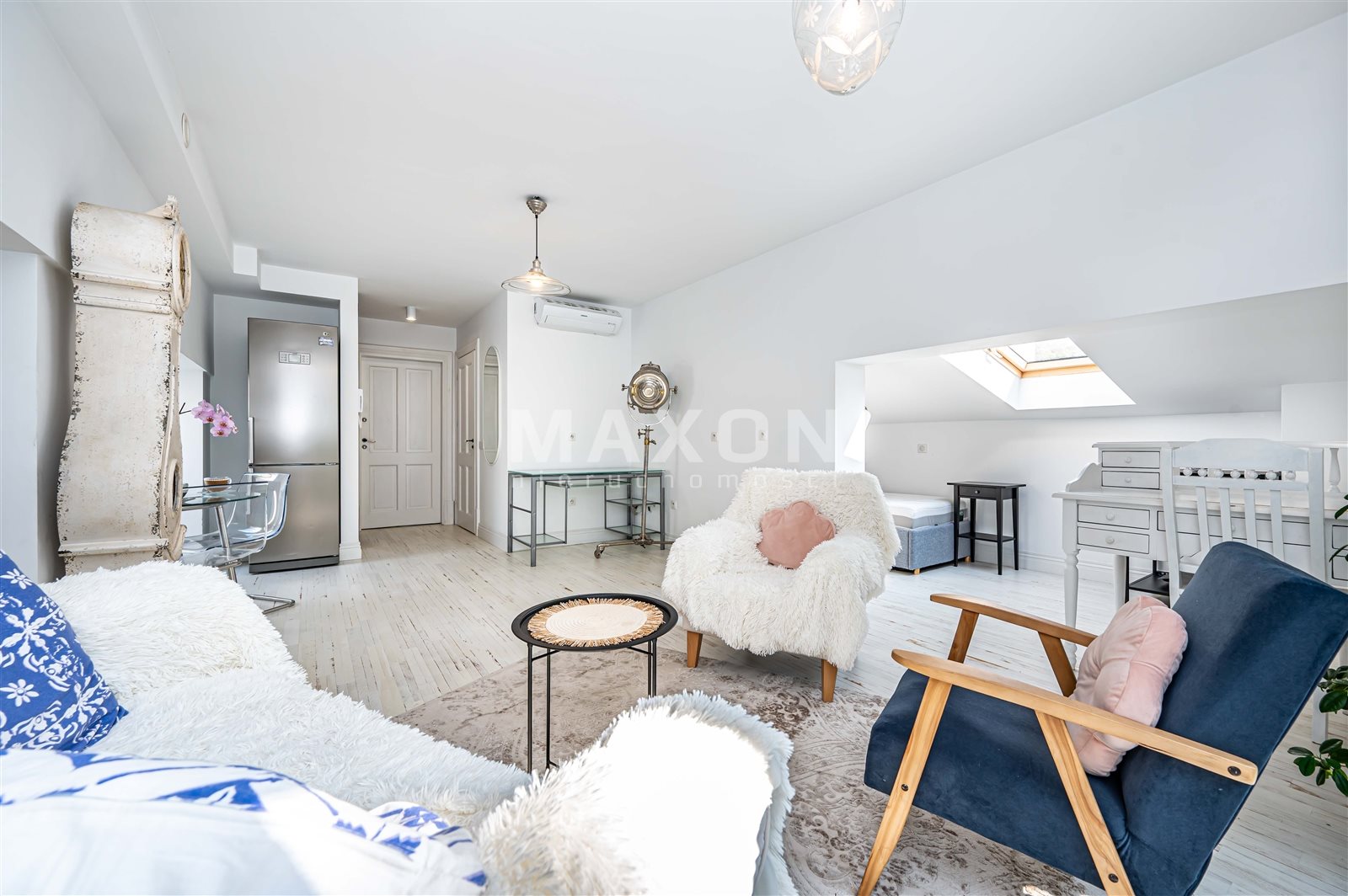- pięknie doświetlonego salonu z rozkładaną kanapą , biurkiem do pracy, miejscem na wypoczynek oraz na aneks kuchenny o powierzchni ok. 17 m2,