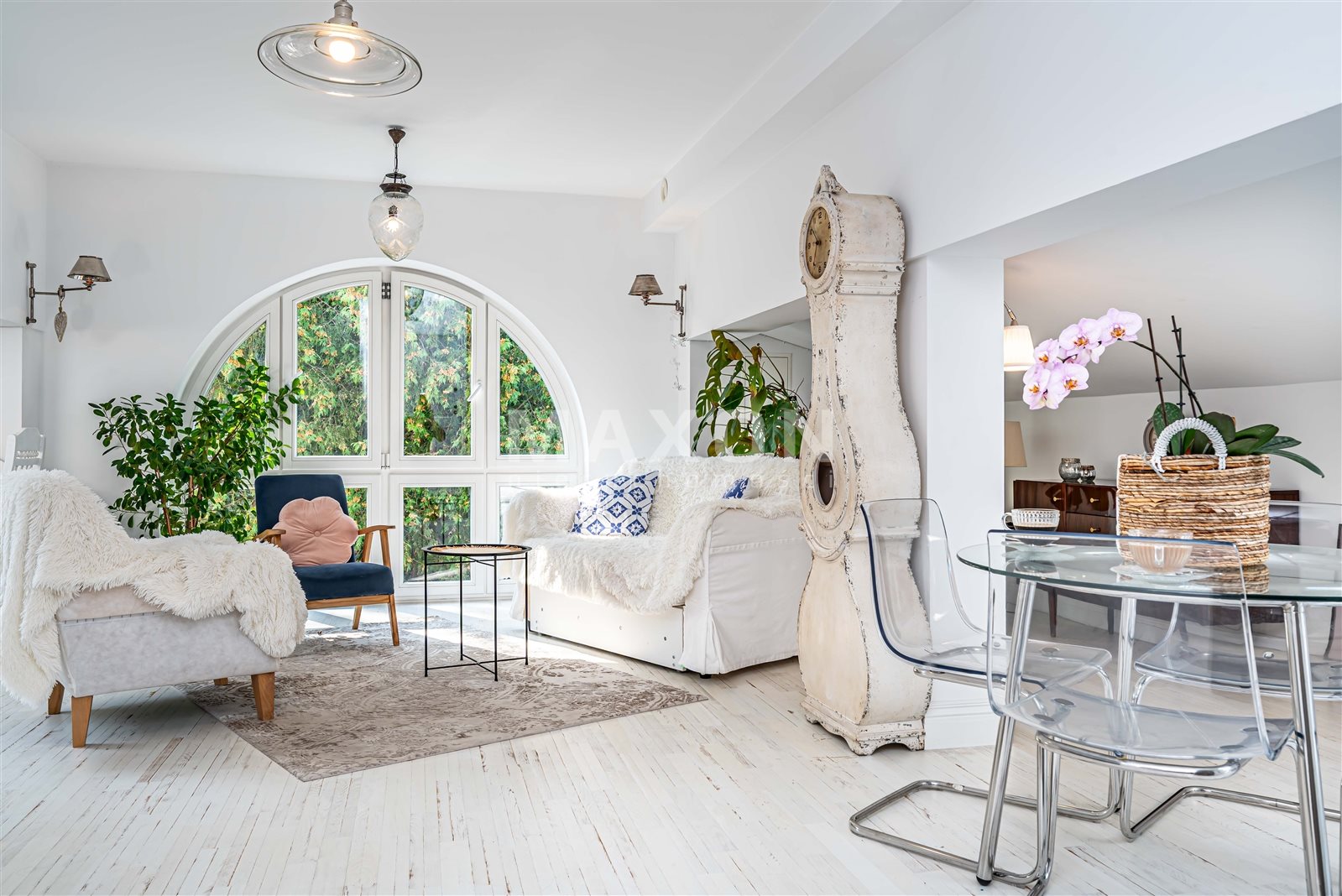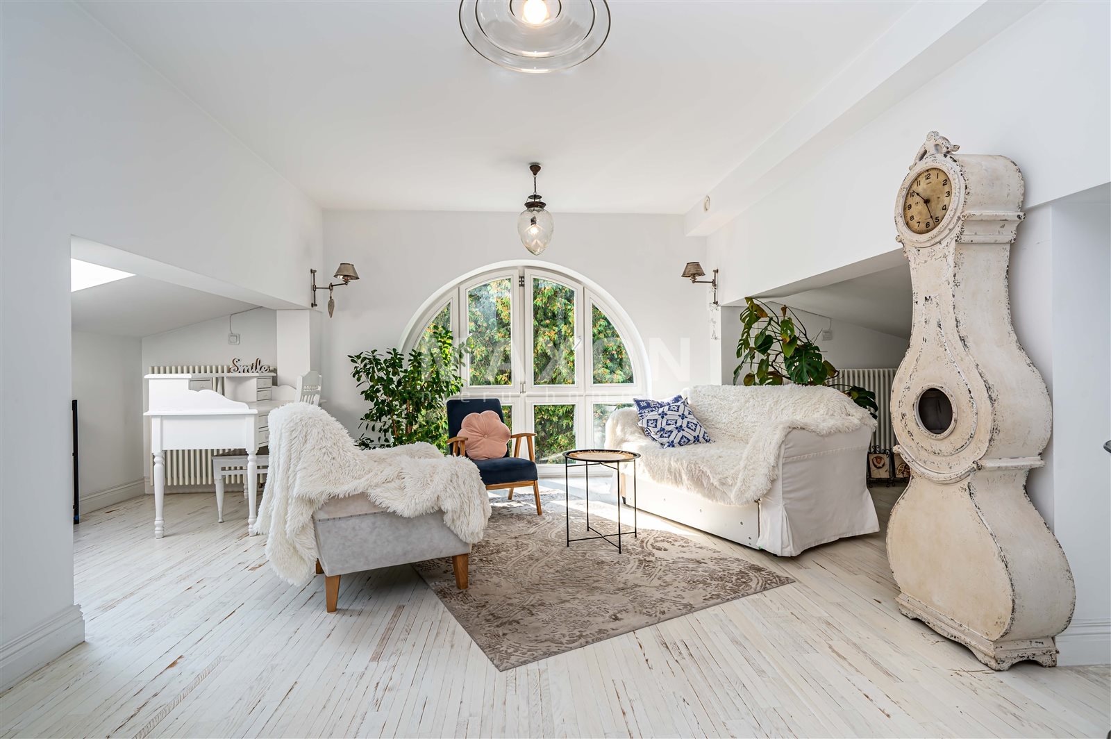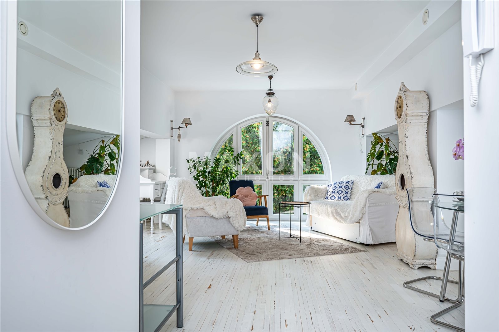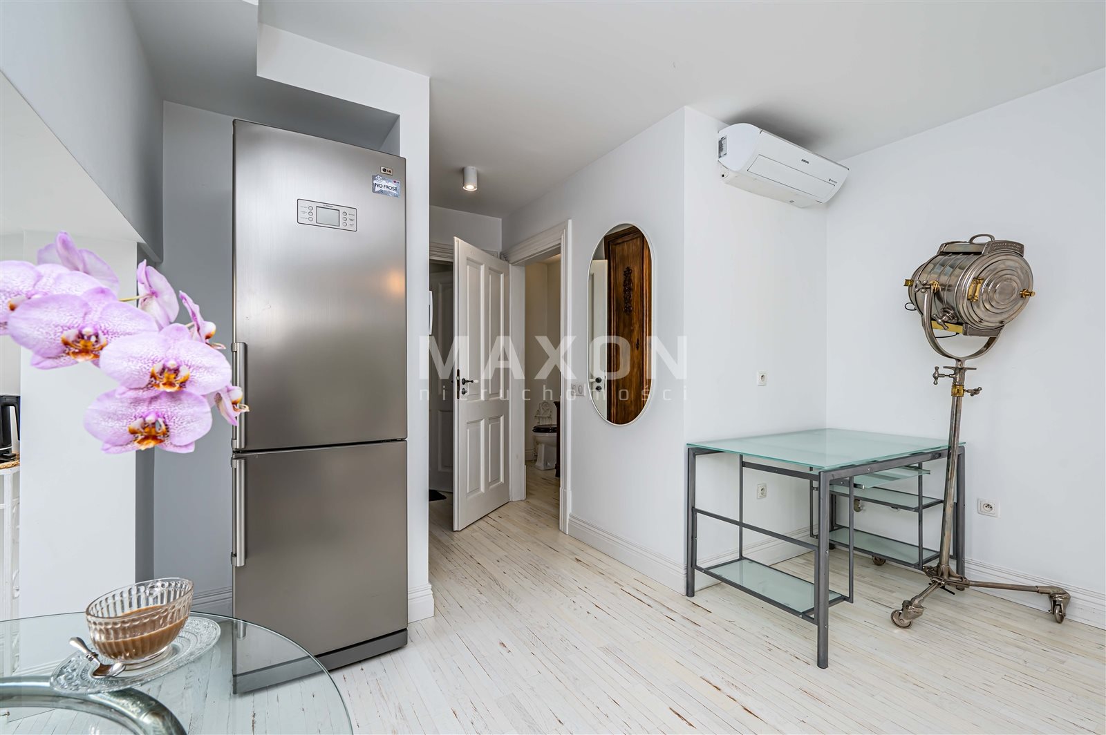 - pięknie doświetlonego salonu z rozkładaną kanapą , biurkiem do pracy, miejscem na wypoczynek oraz na aneks kuchenny o powierzchni ok. 17 m2,