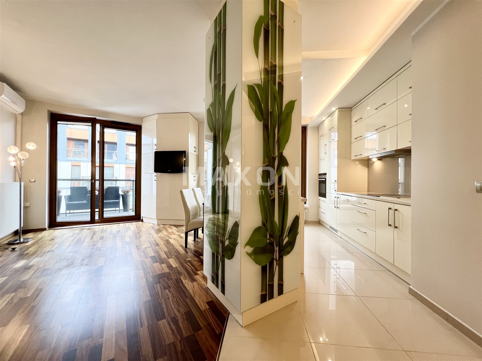 • Salon z aneksem kuchennym i wyjściem na balkon z widokiem na wewnętrzne patio,