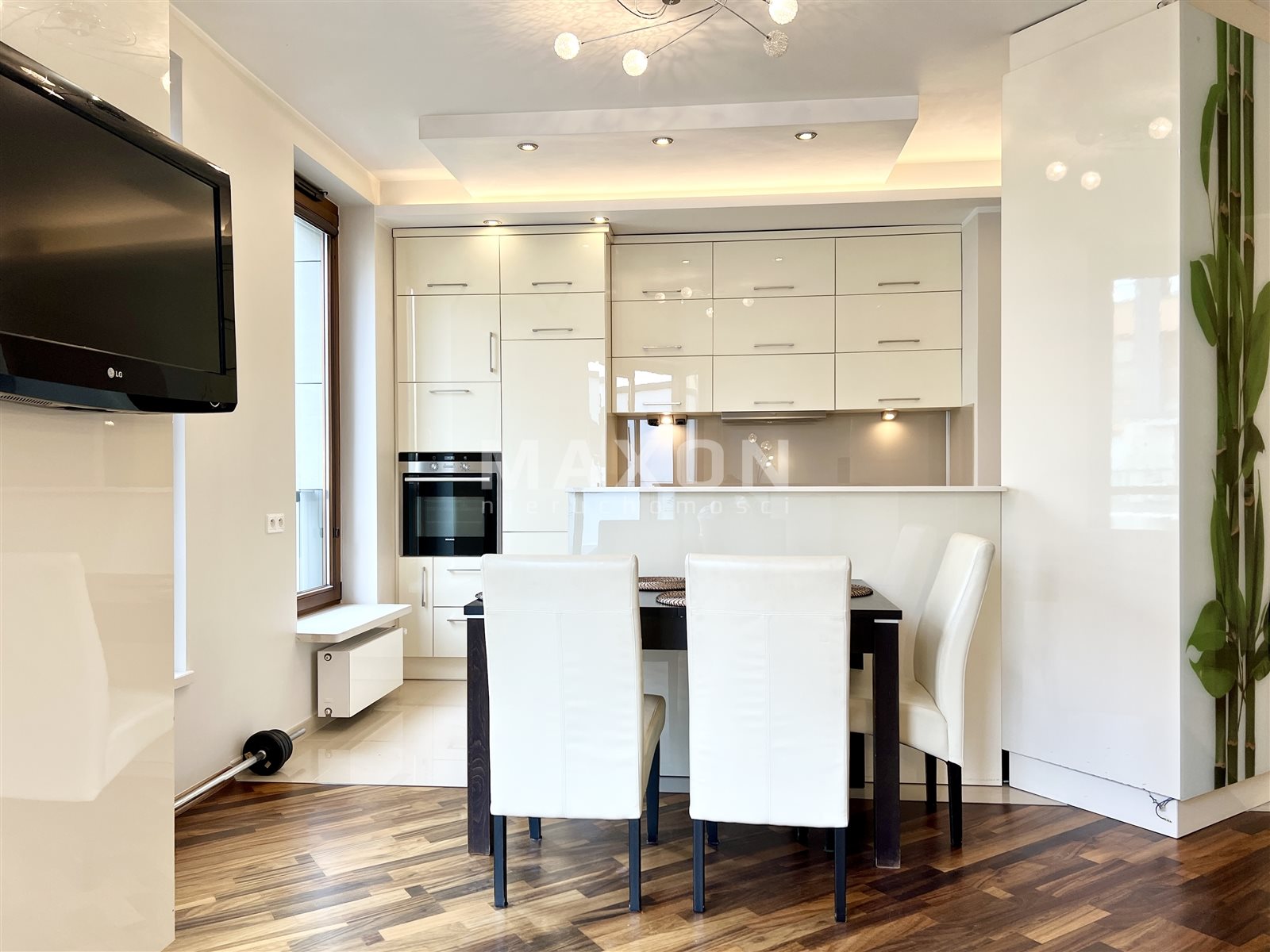 Wysokie pomieszczenia (ok. 2,8 m), klimatyzacja oraz podłogi wykończone deską barlinecką tworzą eleganckie, przytulne wnętrze.
