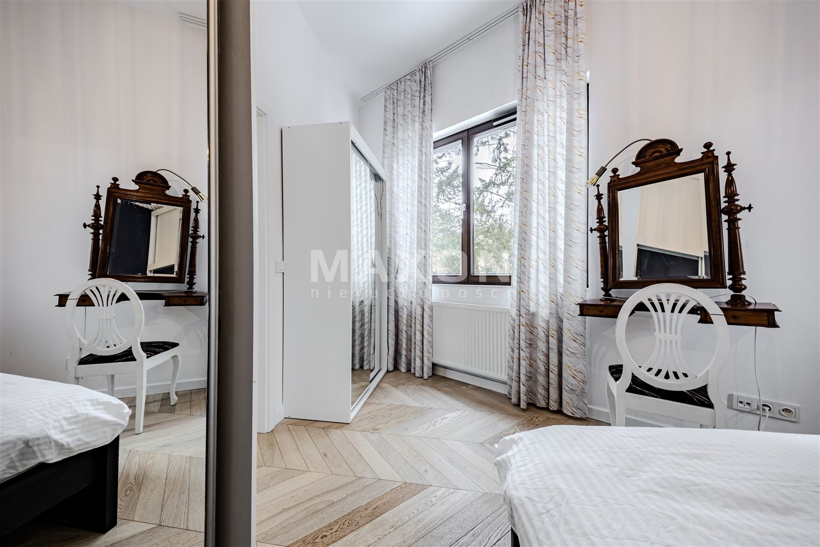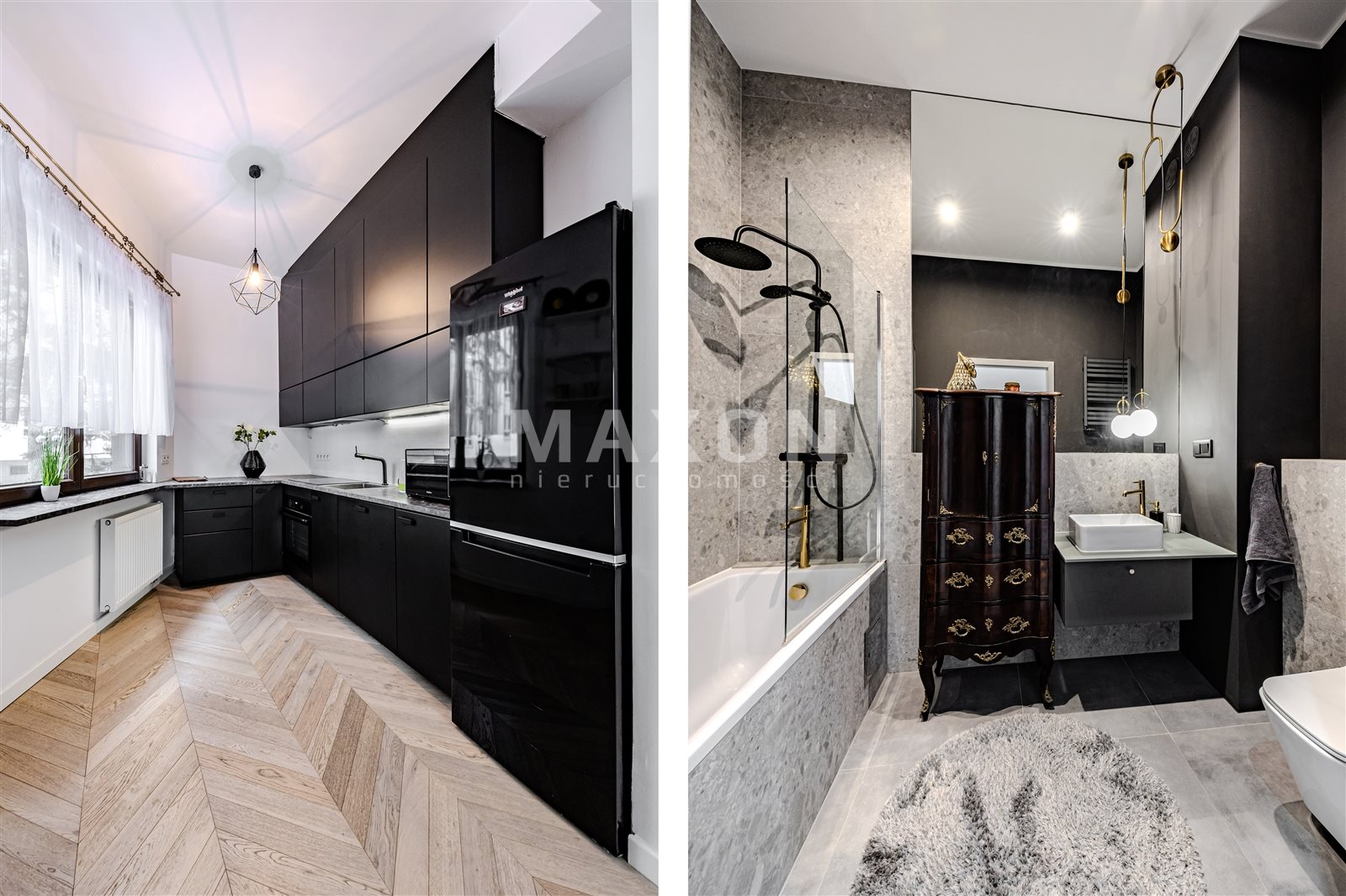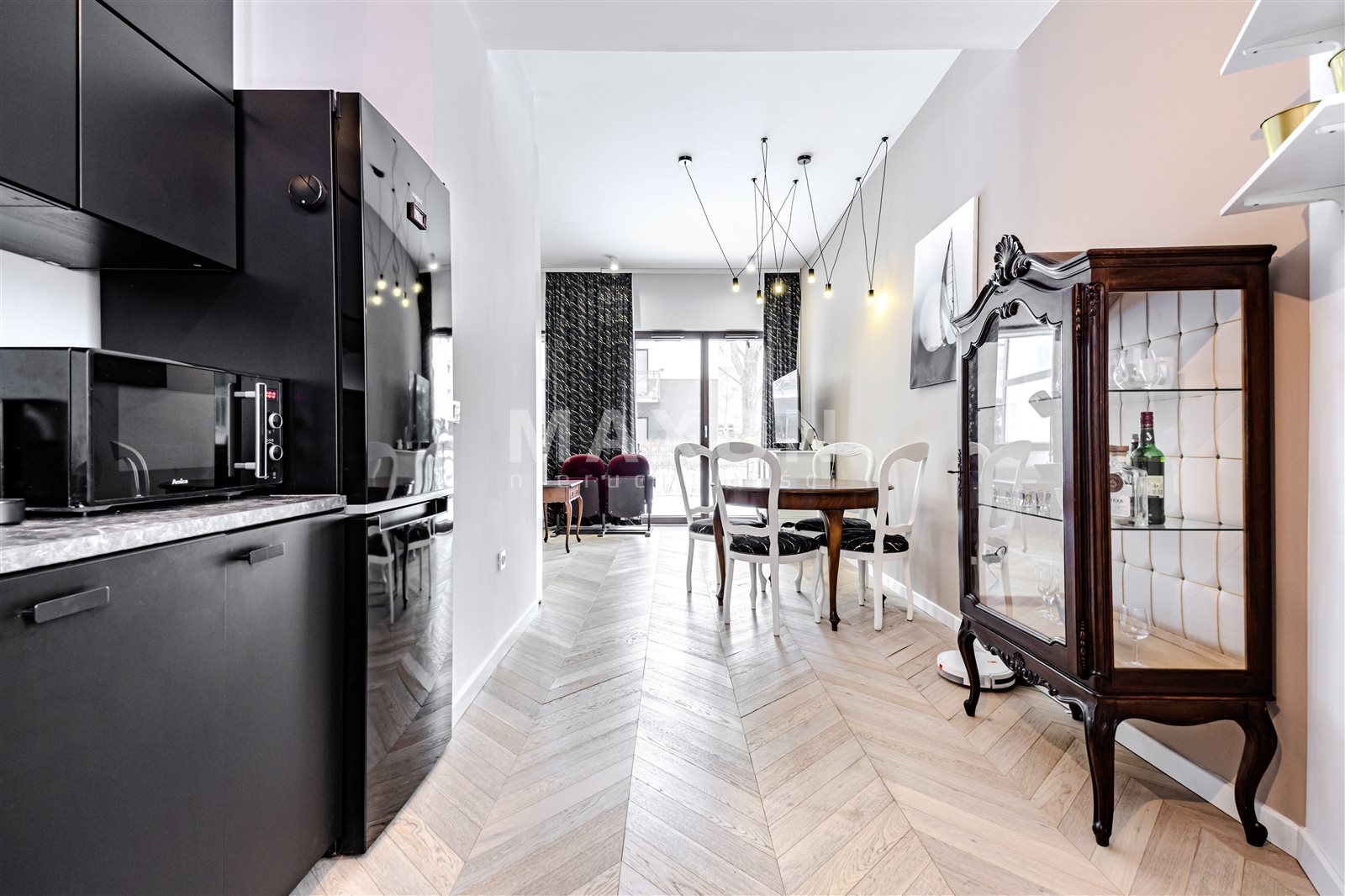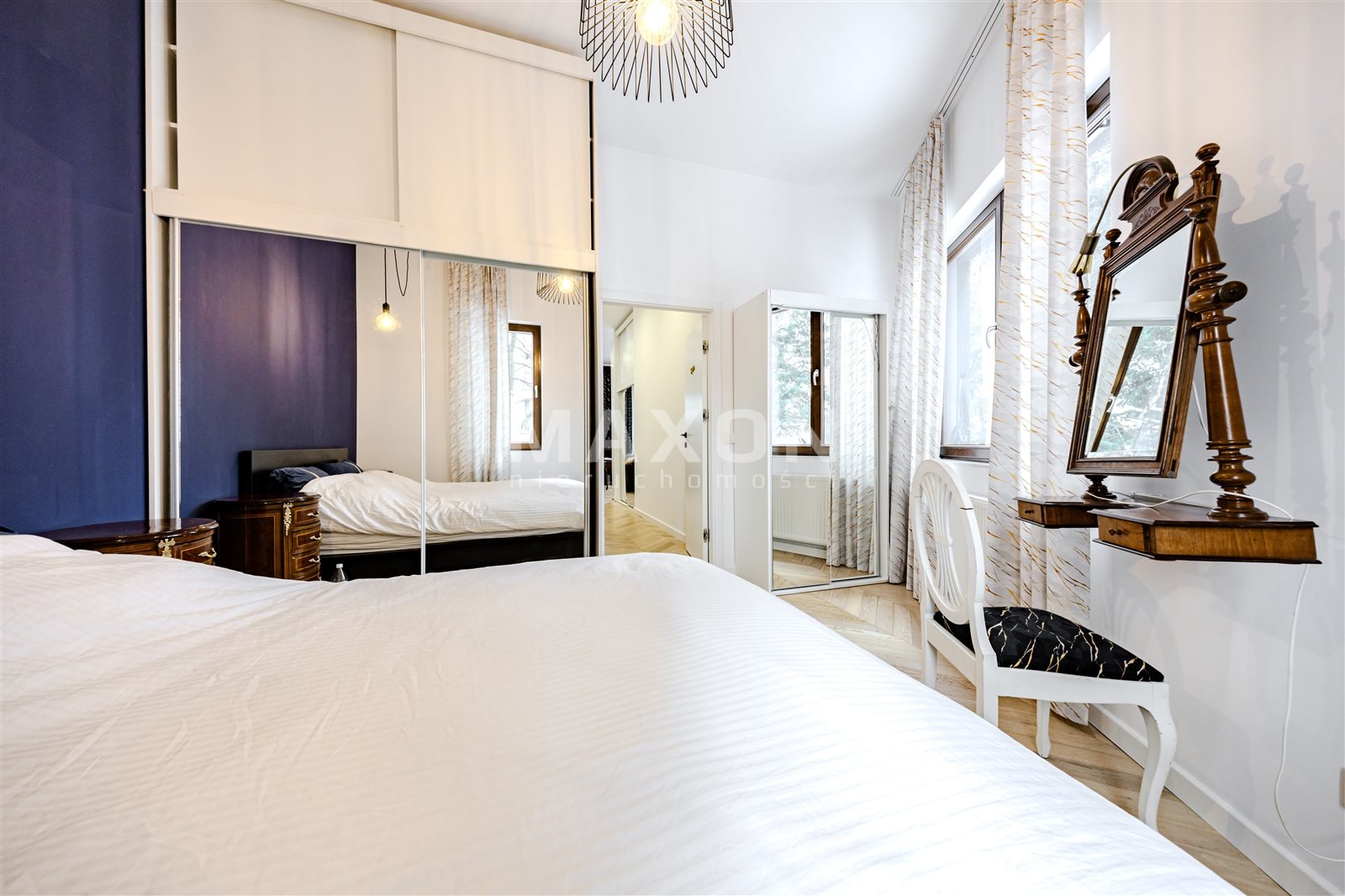 Imponująca wysokość 3,10 m potęguje poczucie przestrzeni. Zabudowy wykonane na zamówienie zapewniają doskonałą organizację. Wnętrze urządzone z dbałością o detale – subtelne połączenie klasycznych mebli w stylu ludwikowskim z nowoczesnym designem.