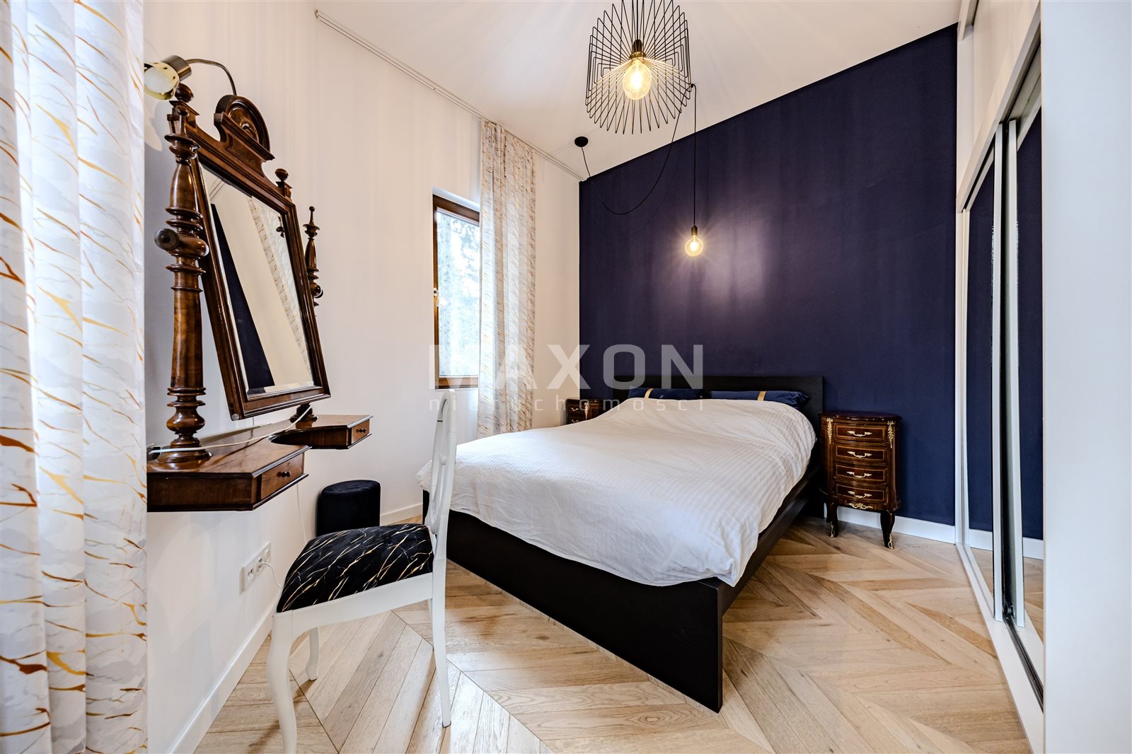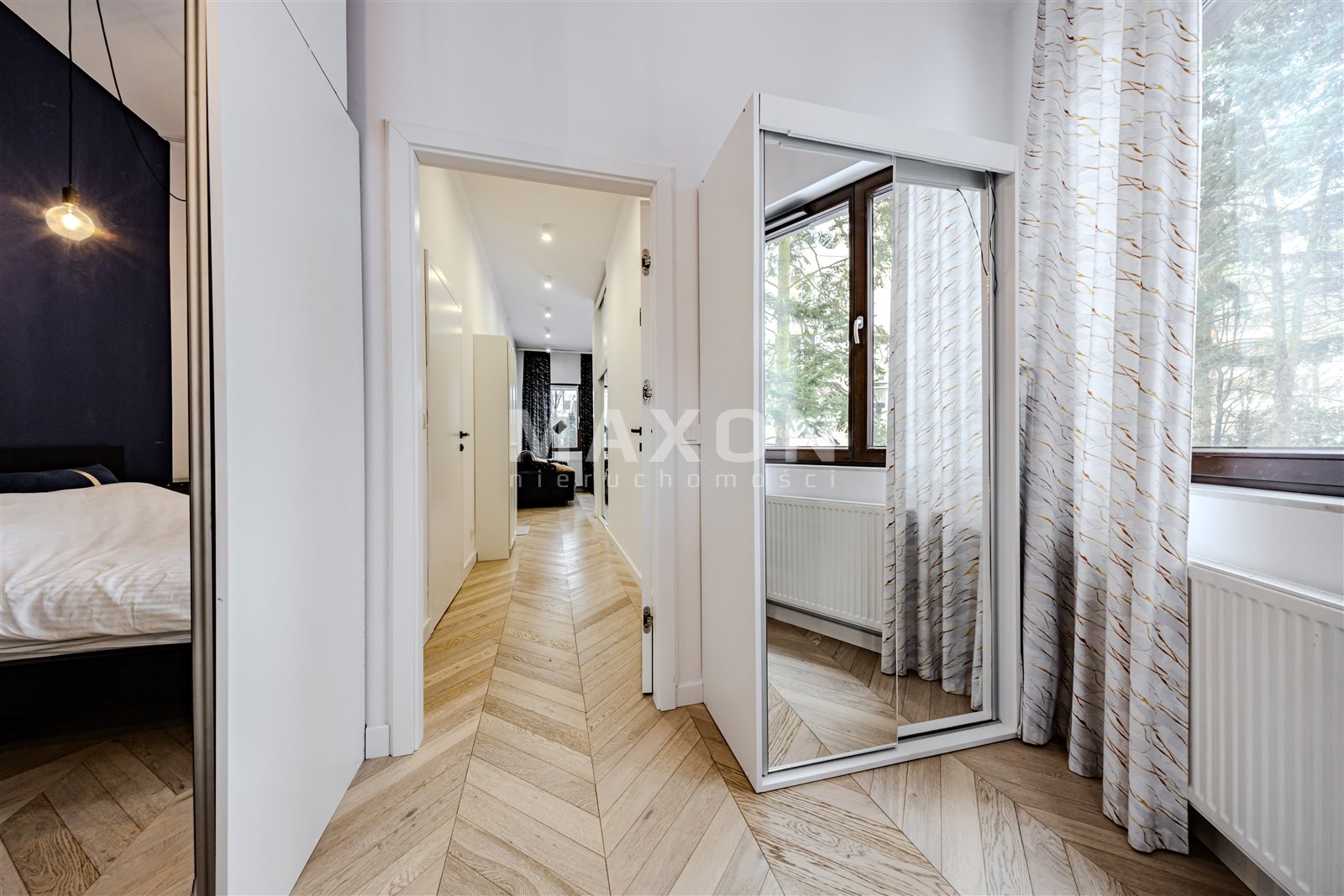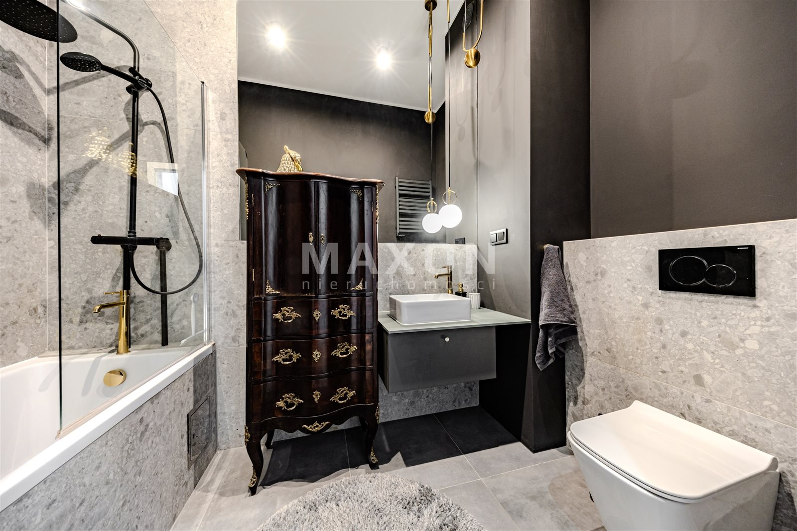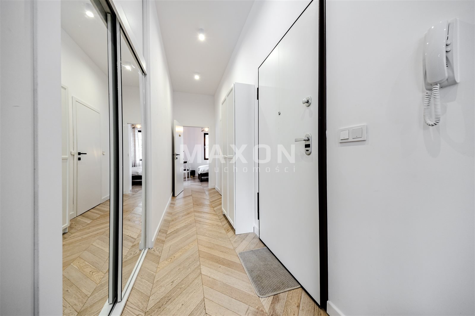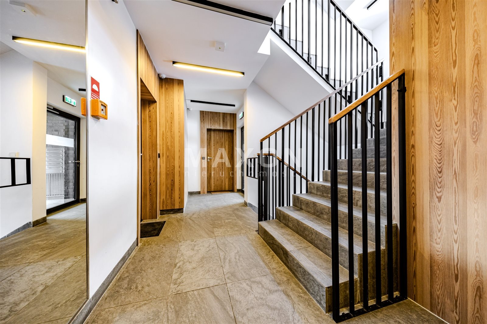 Imponująca wysokość 3,10 m potęguje poczucie przestrzeni. Zabudowy wykonane na zamówienie zapewniają doskonałą organizację. Wnętrze urządzone z dbałością o detale – subtelne połączenie klasycznych mebli w stylu ludwikowskim z nowoczesnym designem.