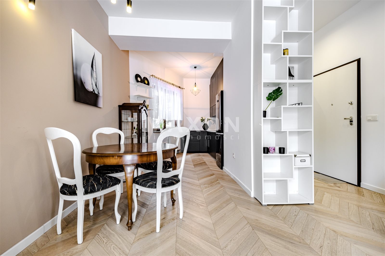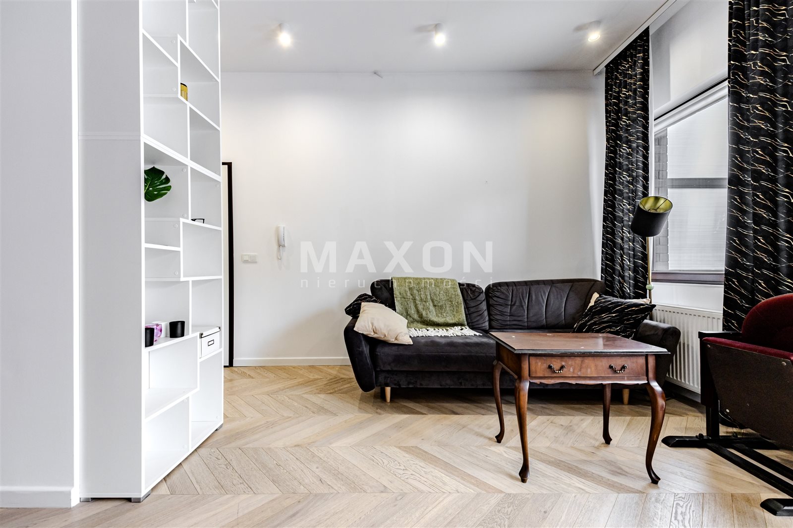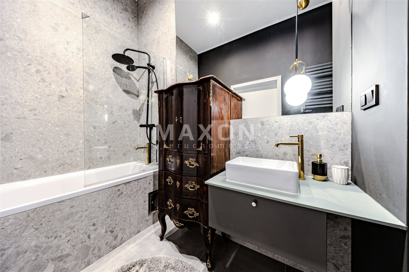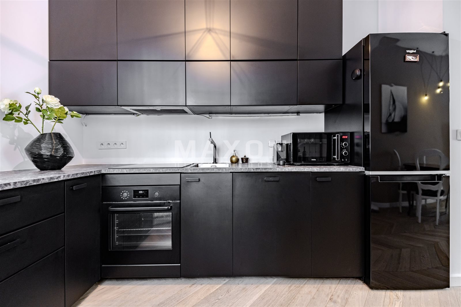 Imponująca wysokość 3,10 m potęguje poczucie przestrzeni. Zabudowy wykonane na zamówienie zapewniają doskonałą organizację. Wnętrze urządzone z dbałością o detale – subtelne połączenie klasycznych mebli w stylu ludwikowskim z nowoczesnym designem.