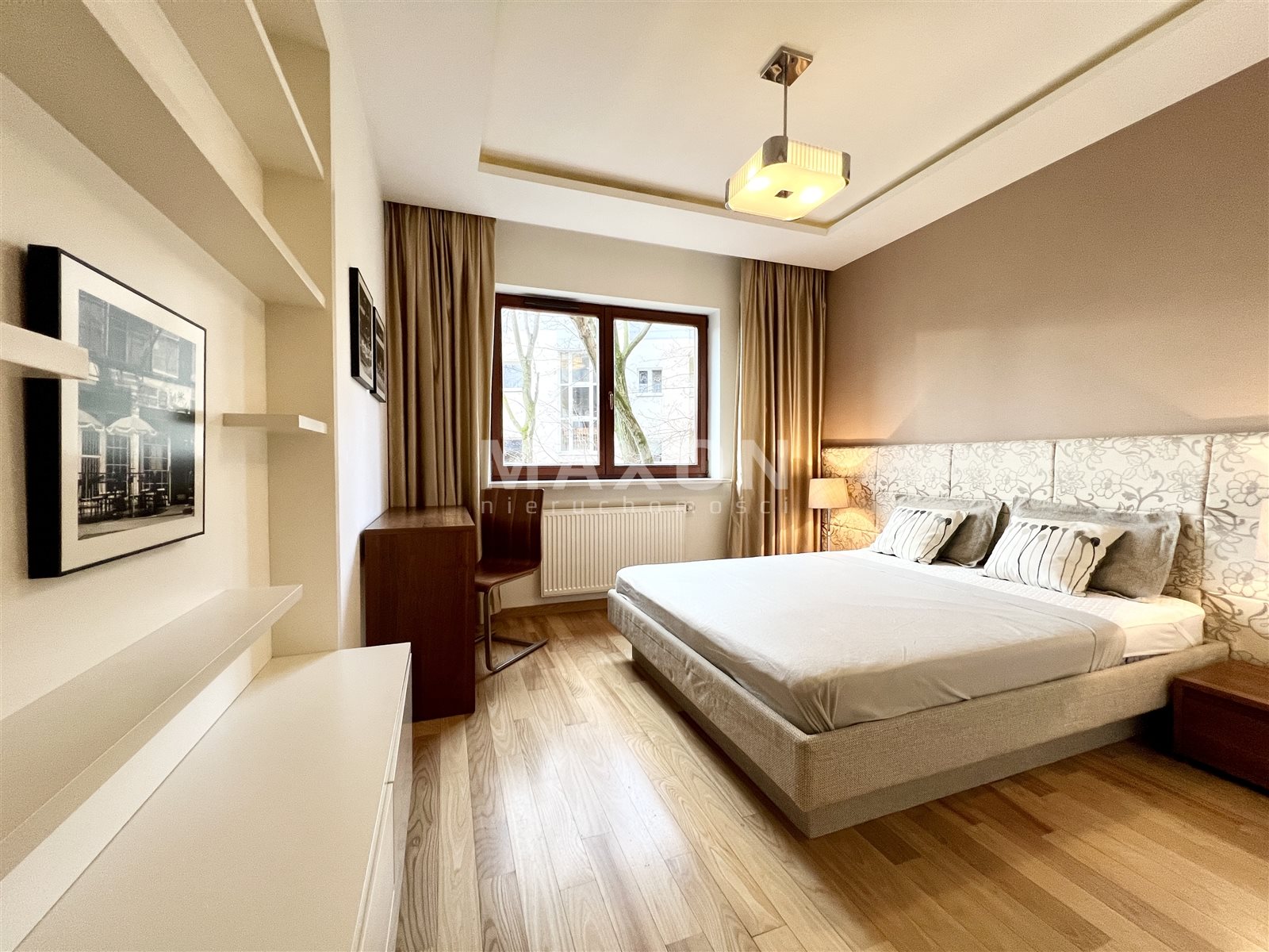 Apartament jest w pełni wyposażony w meble wykonane na zamówienie, a w pokojach znajduje się drewniana podłoga z wiązu, doskonale współgrająca z kolorystyką wnętrz.