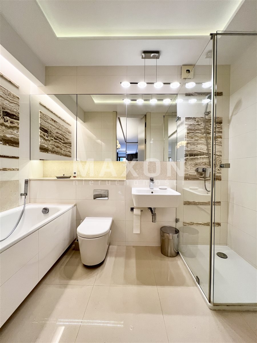 W łazience gres polerowany, marmur i onyks, kabina prysznicowa, wanna, umywalka, i toaleta oraz szafy wnękowe z koszem na pranie. Ogrzewanie podłogowe w kuchni i łazience.