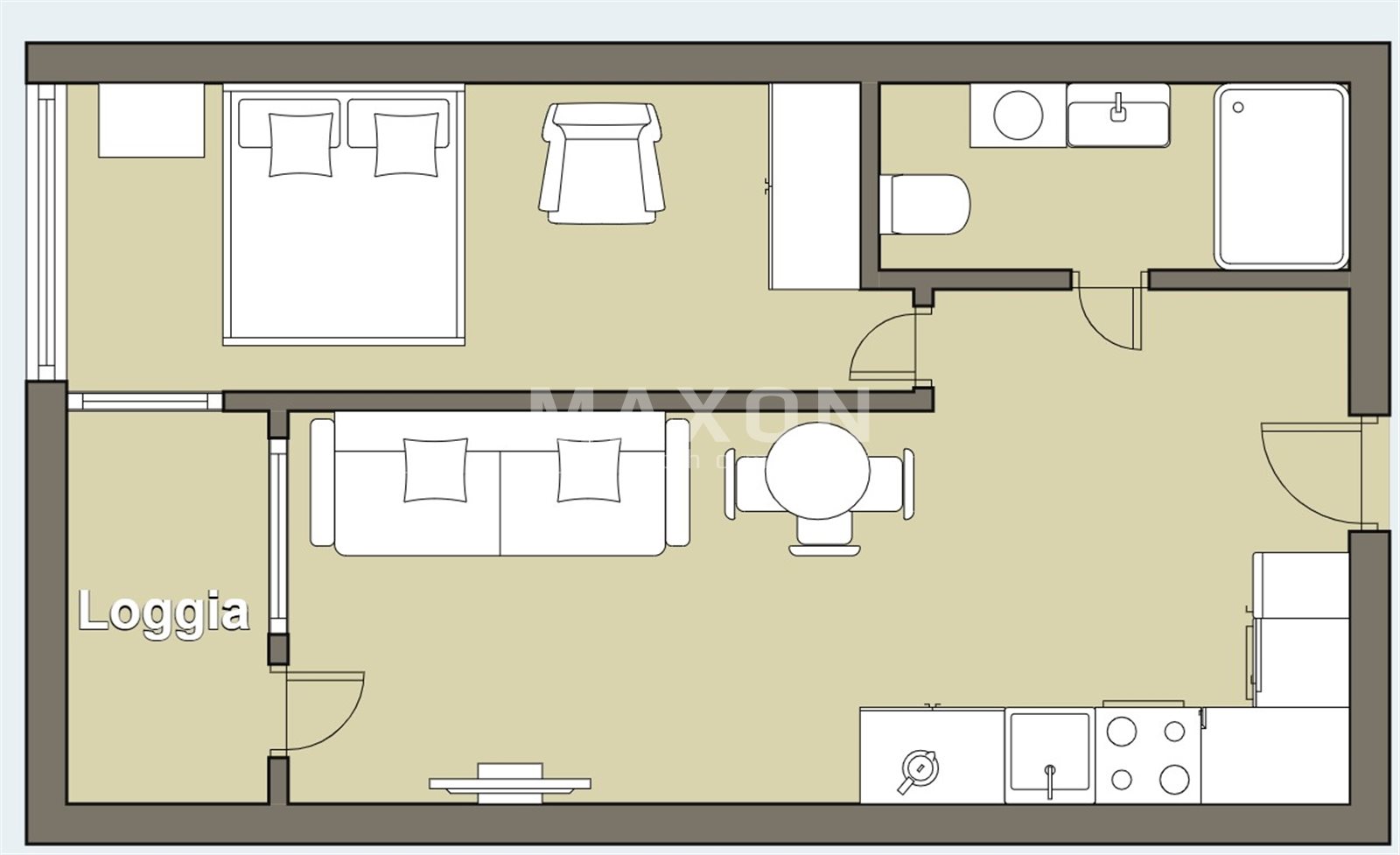 Przemyślany układ daje wyraźny podział na strefę dzienną i prywatną, co jest rzadkością przy tym metrażu.
