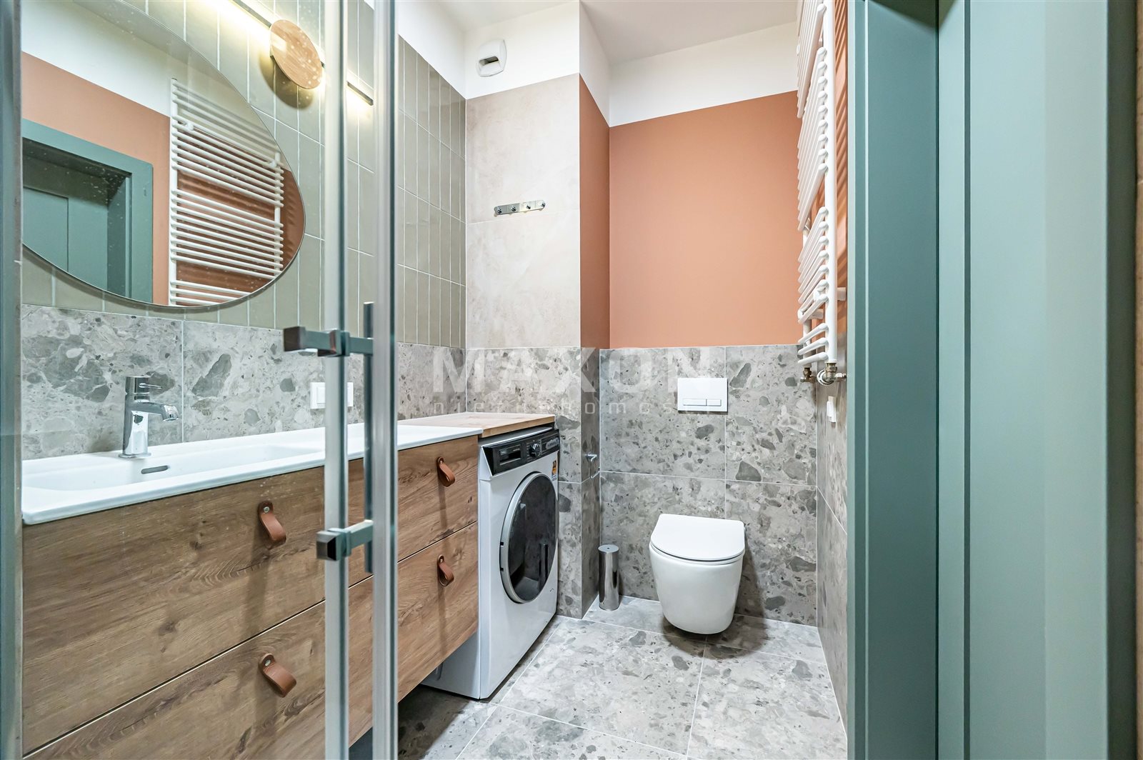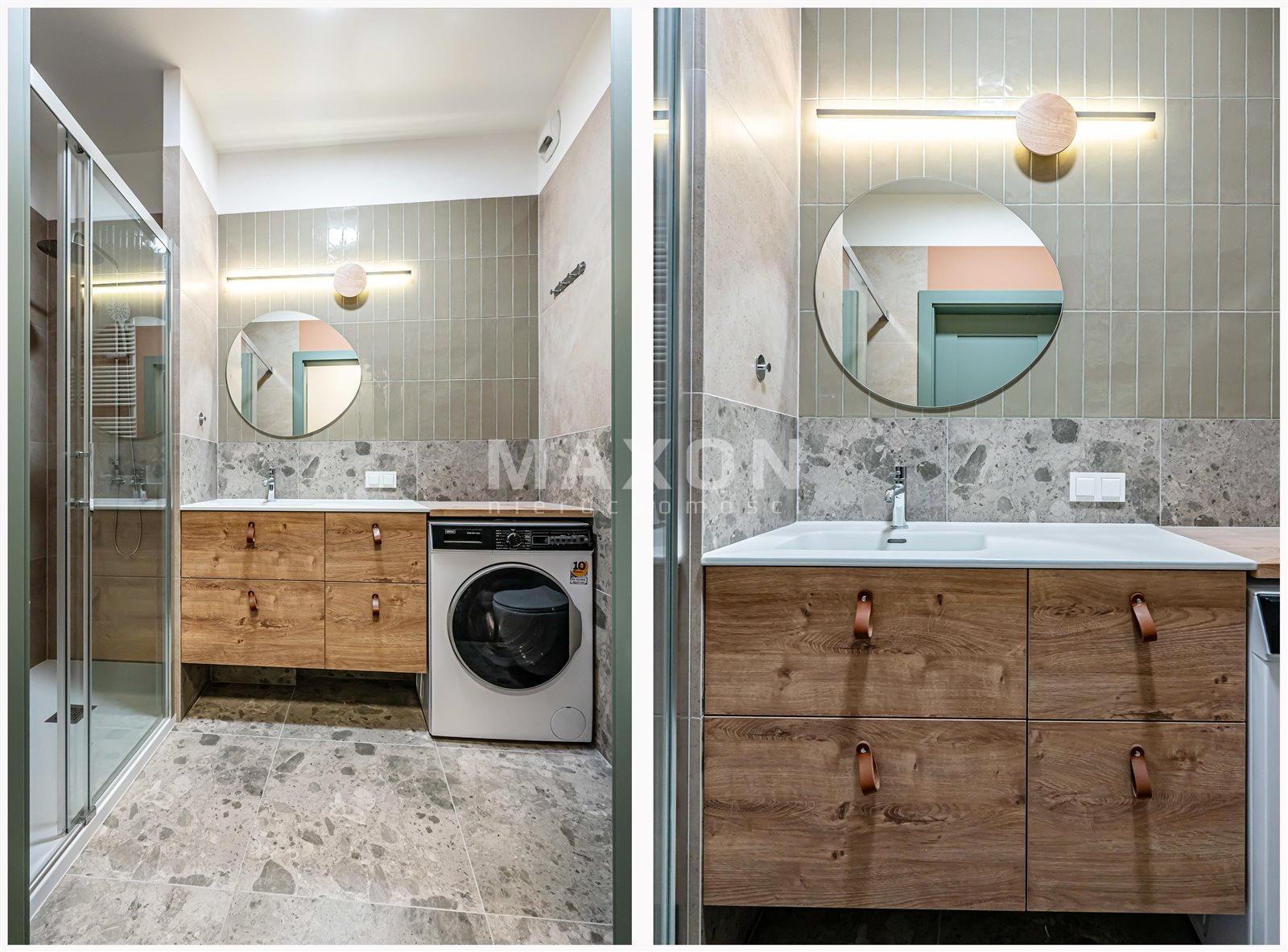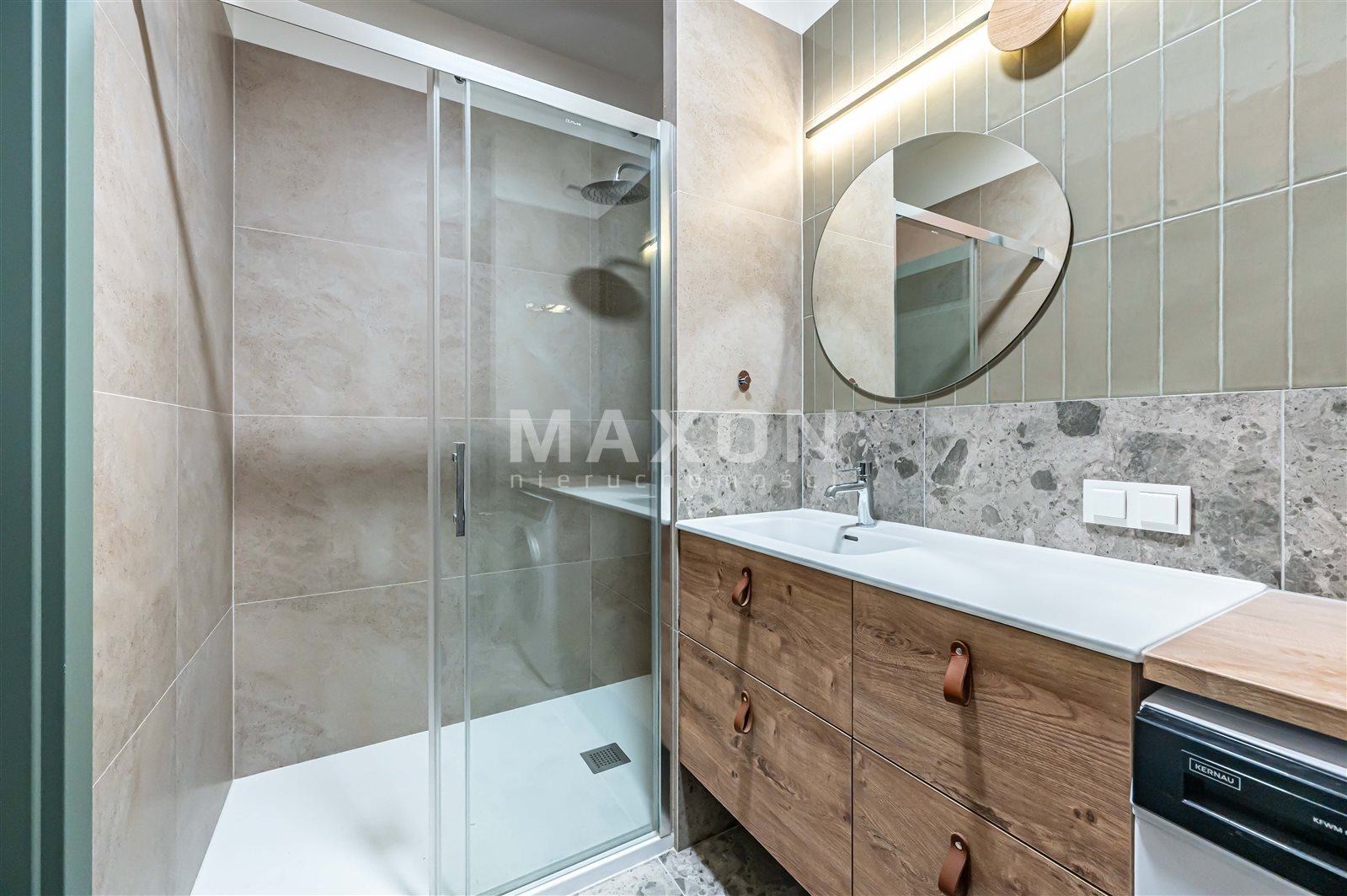 – łazienka 4,77 m2 z prysznicem typu walk in + pralka, duża ilość zamykanych szafek