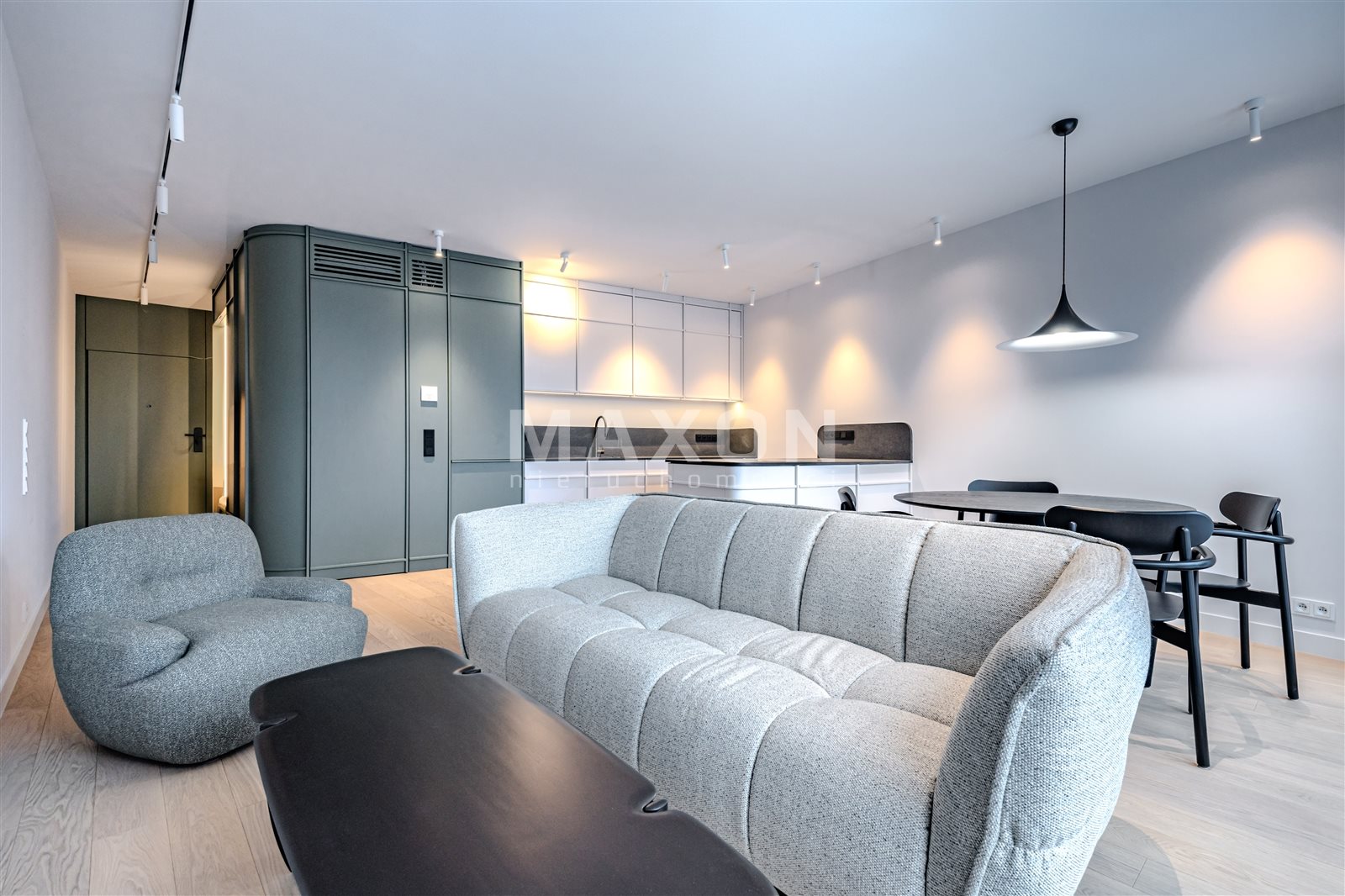 - Salon z aneksem kuchennym: serce domu – jasna, otwarta przestrzeń idealna do wypoczynku i podejmowania gości, do tego elegancko ukryte pomieszczenie do przechowywania / spiżarnia.