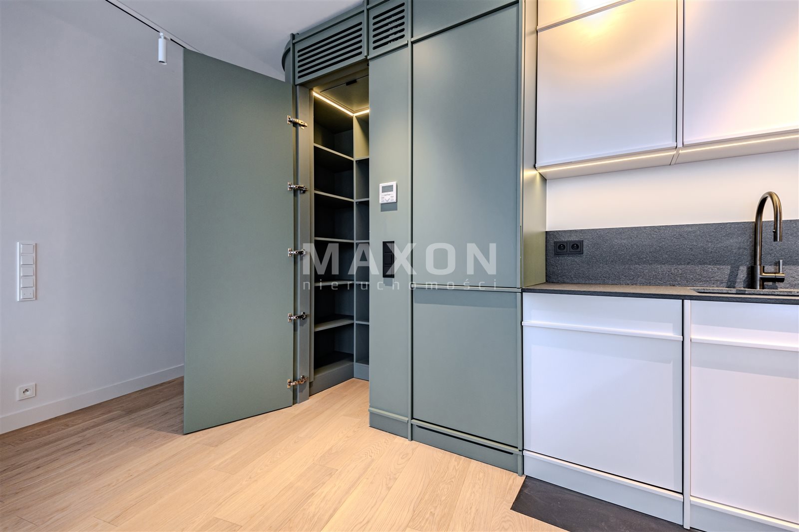 - Wysoki standard wykończenia pomieszczeń: wnętrze zostało zaprojektowane z dbałością o każdy detal. Układ pomieszczeń jest niezwykle funkcjonalny. Do wykończenia użyte zostały materiały najwyższej klasy, meble wykonane na zamówienie. Mieszkanie posiada imponującą liczbę miejsc do przechowywania (szafy wnękowe, zabudowy, garderoba w sypialni)