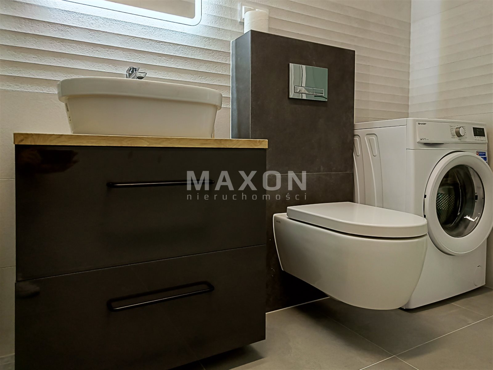 łazienka: kabina prysznicowa, pralka, szafka, lustro