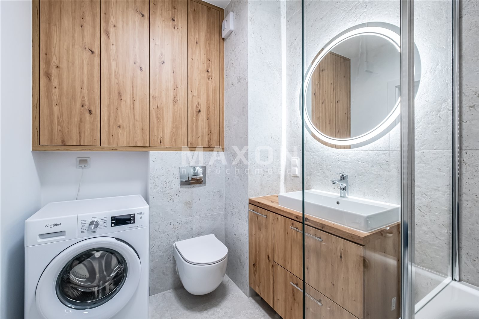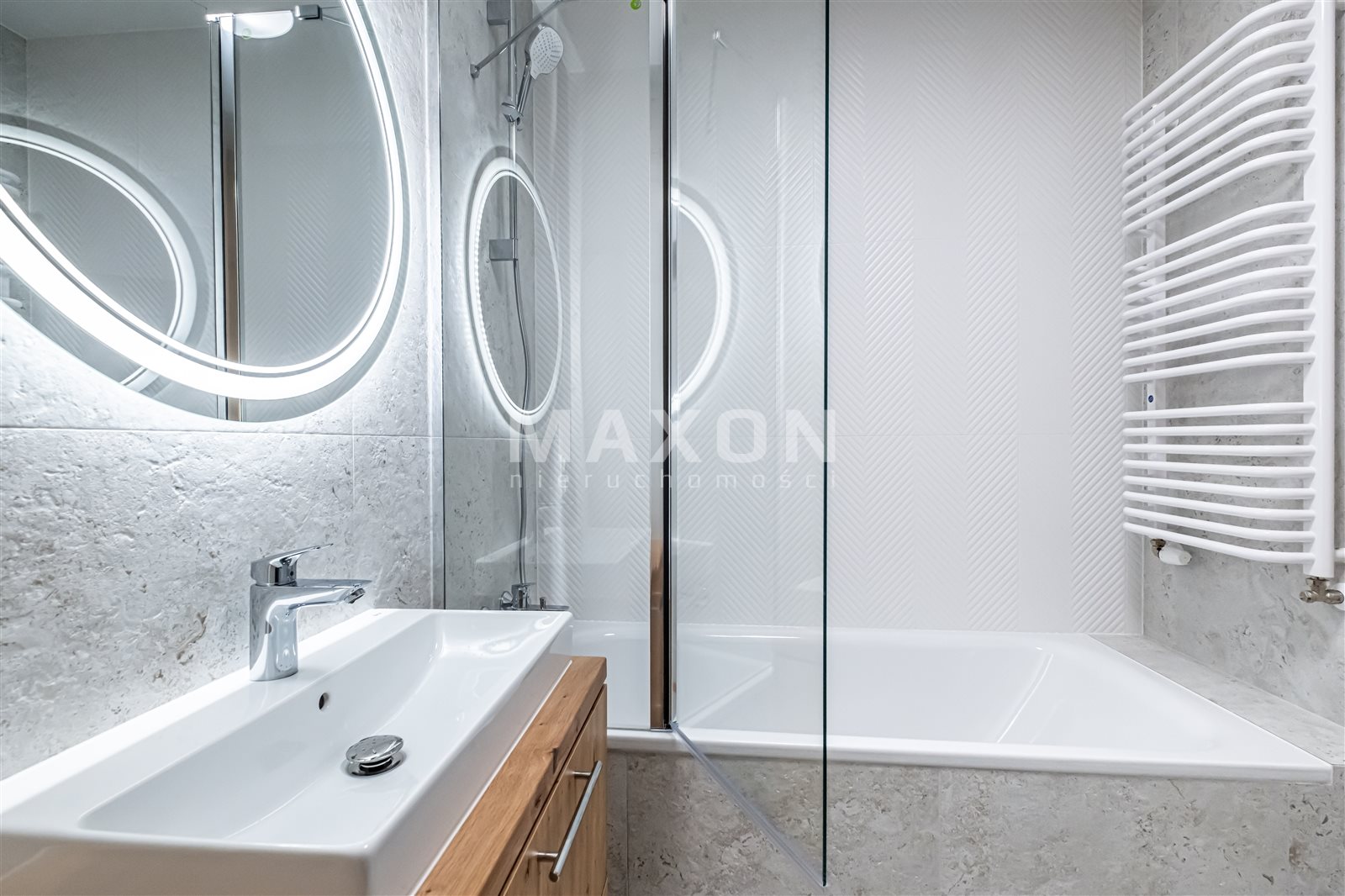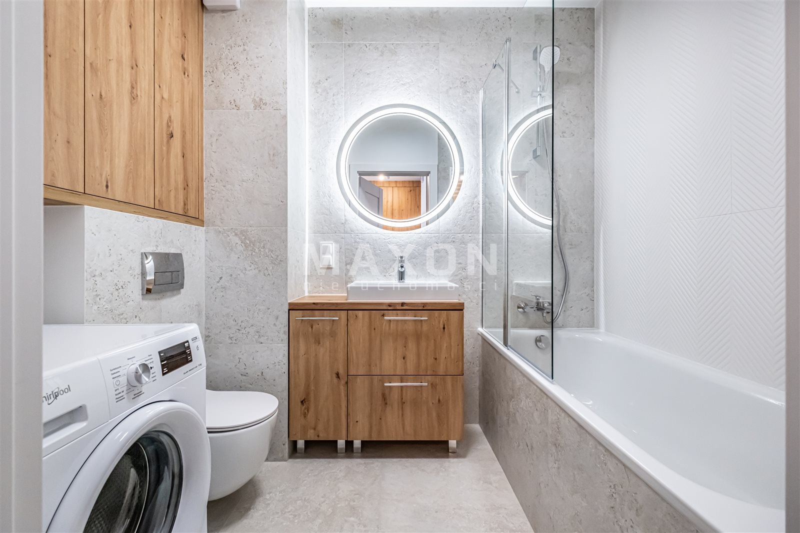 Łazienka: wanna z funkcją prysznica, pralka, umywalka, podświetlane lustro, wc, szafki.