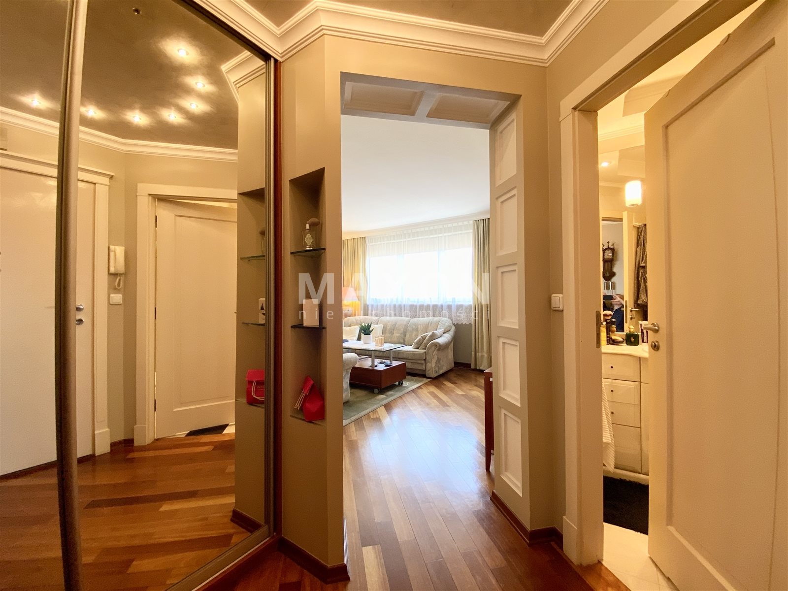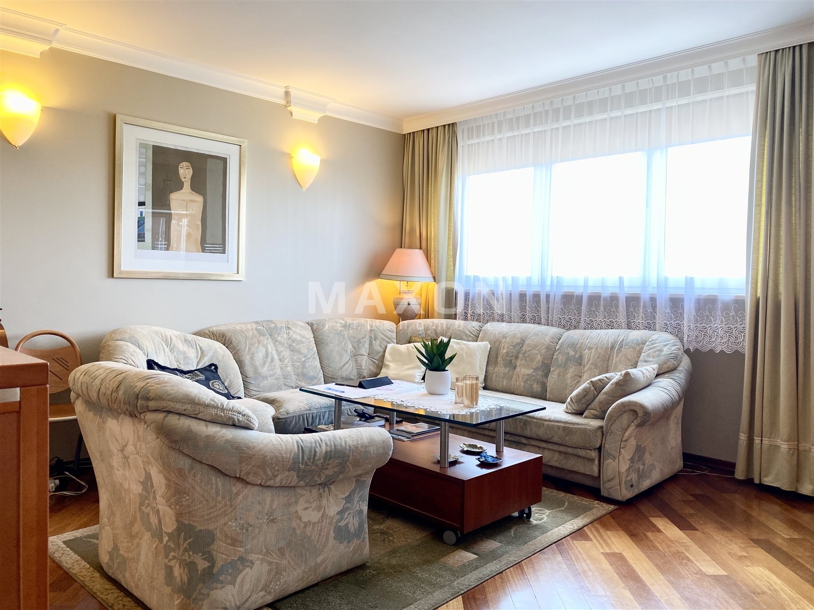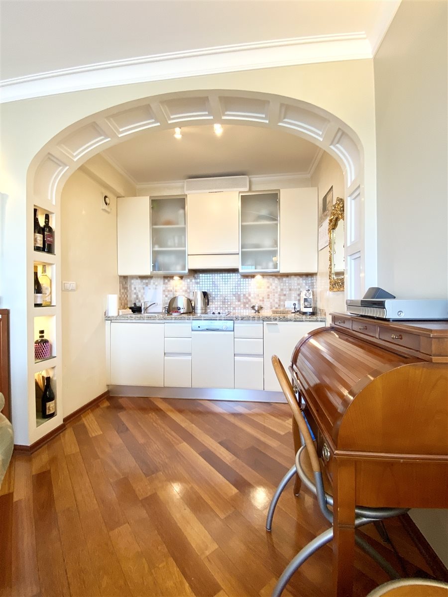 Mieszkanie wykończone najlepszymi materiałami – wysokiej klasy podłogi, nowoczesna kuchnia z sprzętem AGD premium i eleganckie łazienki.