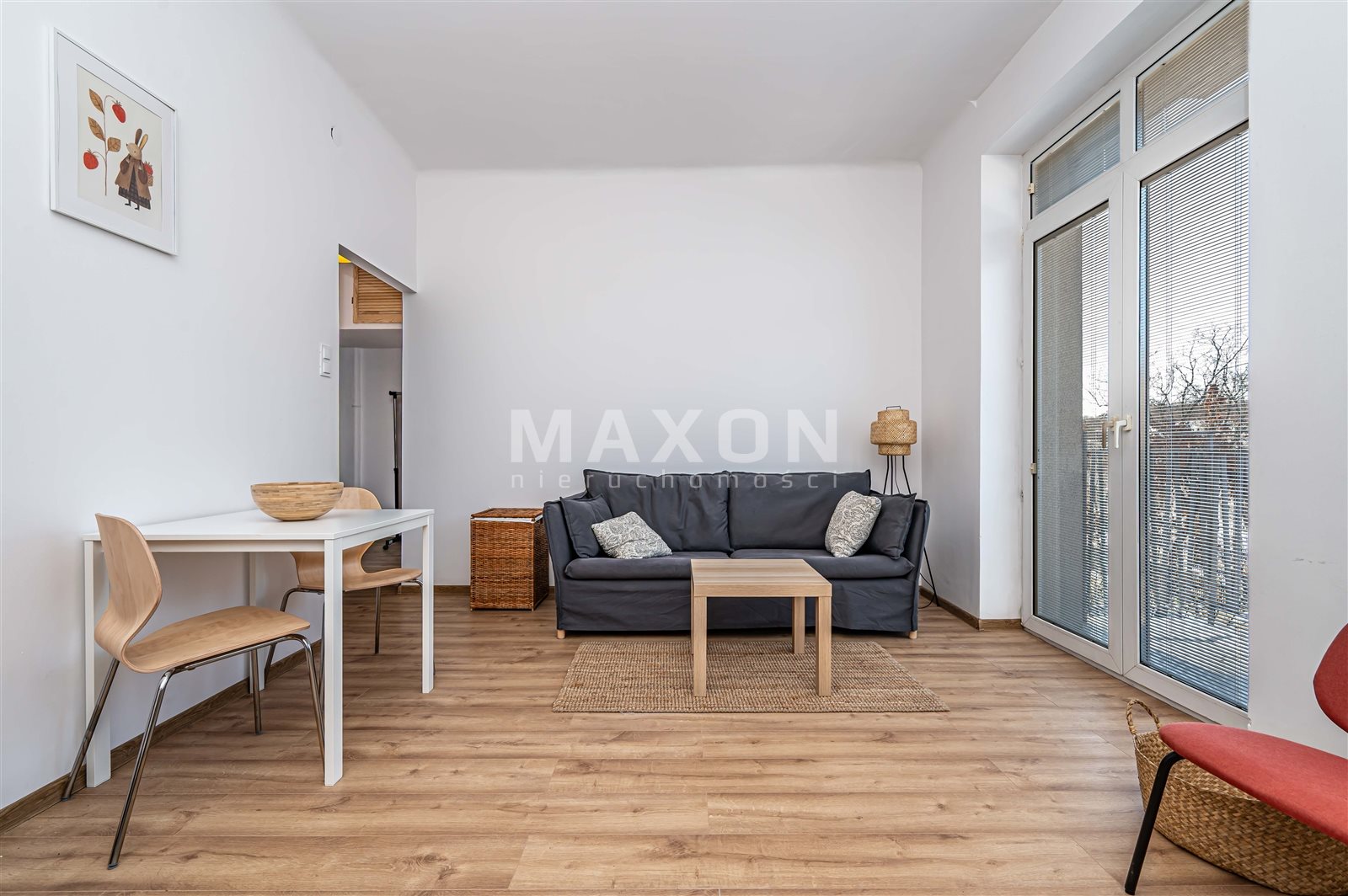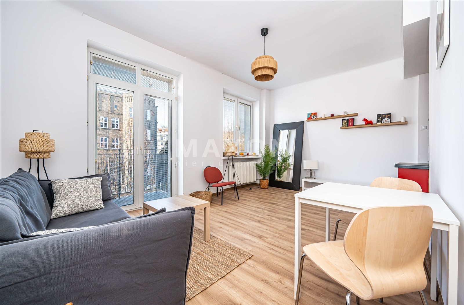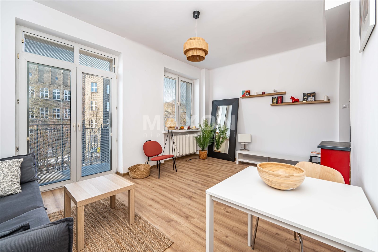 - Salon z wyjściem na balkon – idealne miejsce na poranną kawę lub wieczorny relaks, z widokiem na ul. Rozbrat