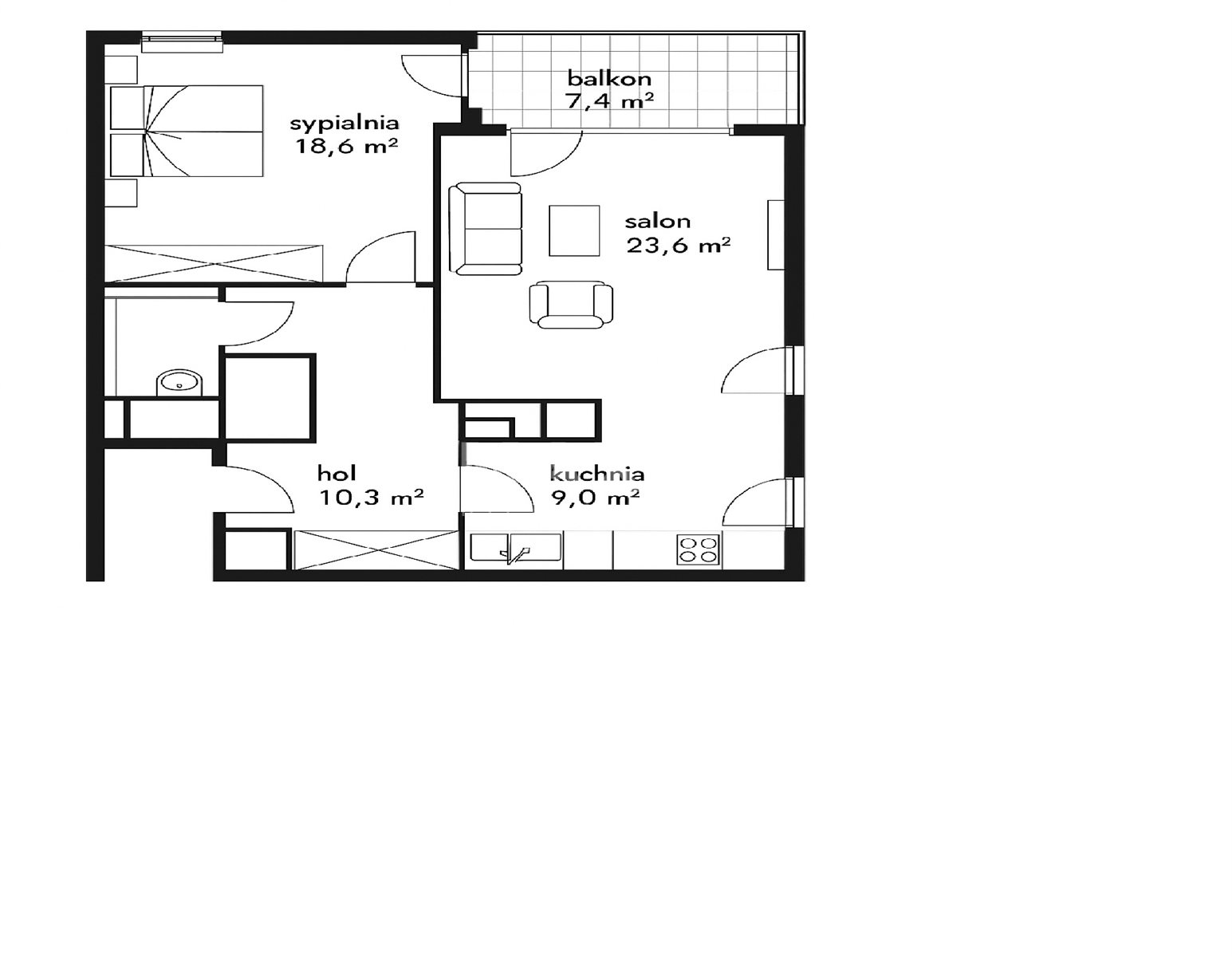 - Salon z aneksem kuchennym – przestronny, jasny, z dużymi oknami i wyjściem na balkon. Aneks kuchenny w pełni wyposażony w niezbędny sprzęt AGD.