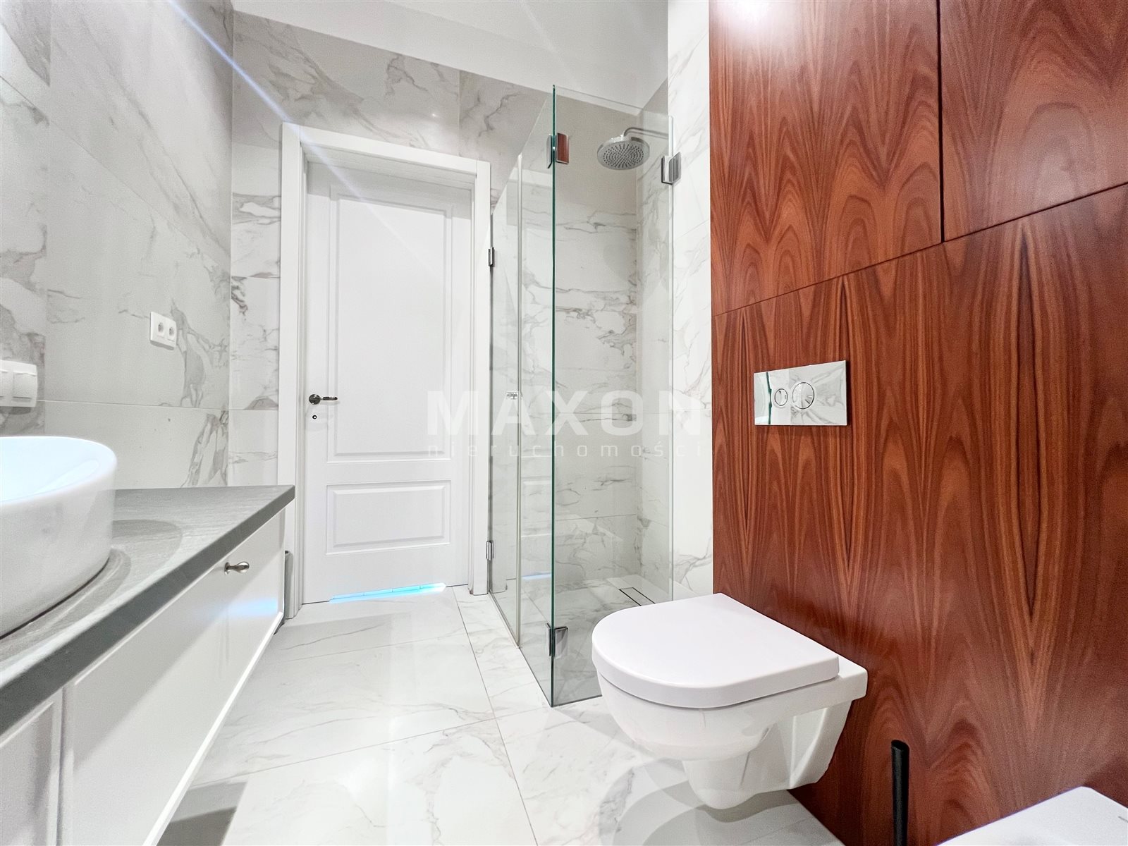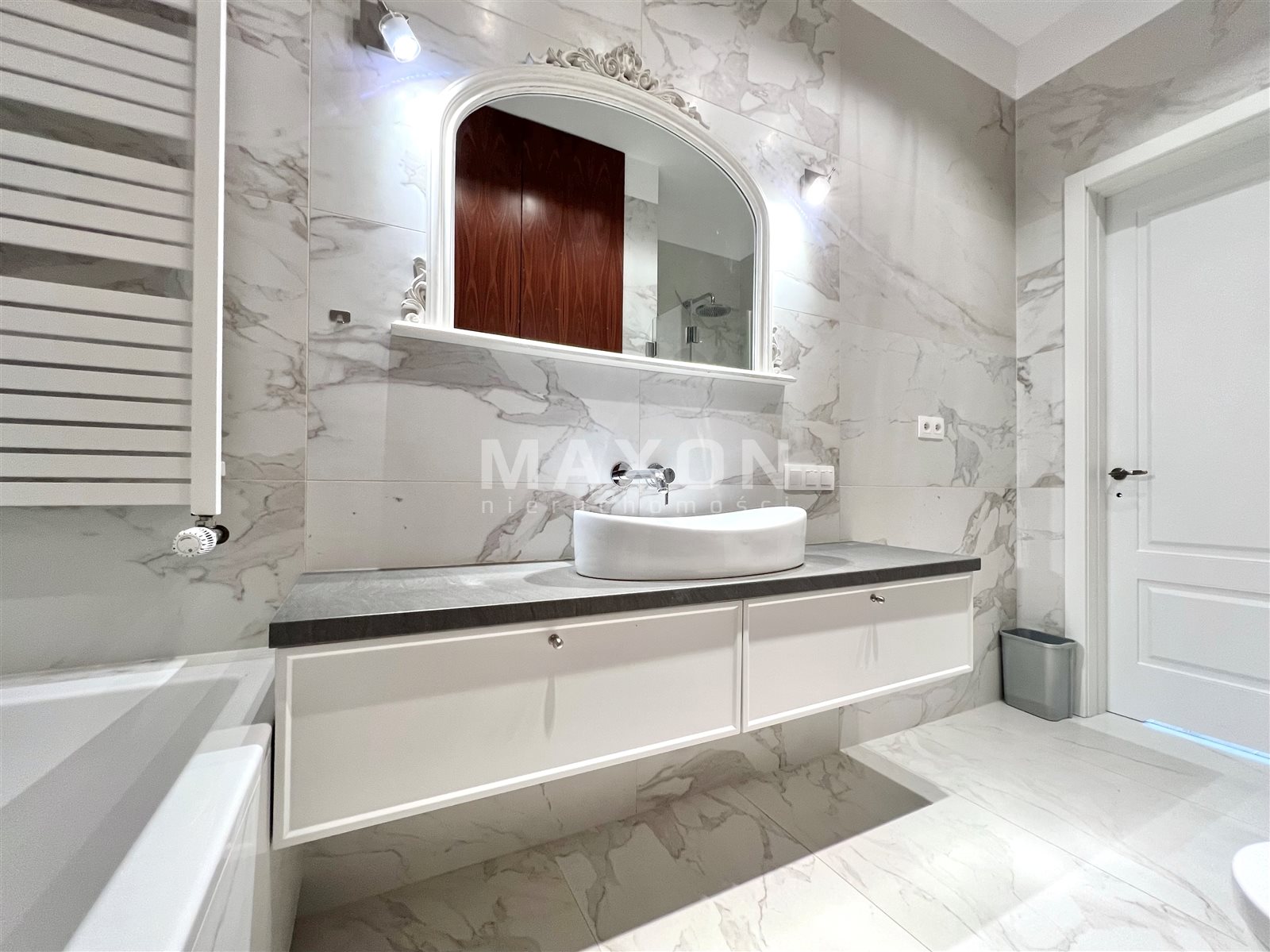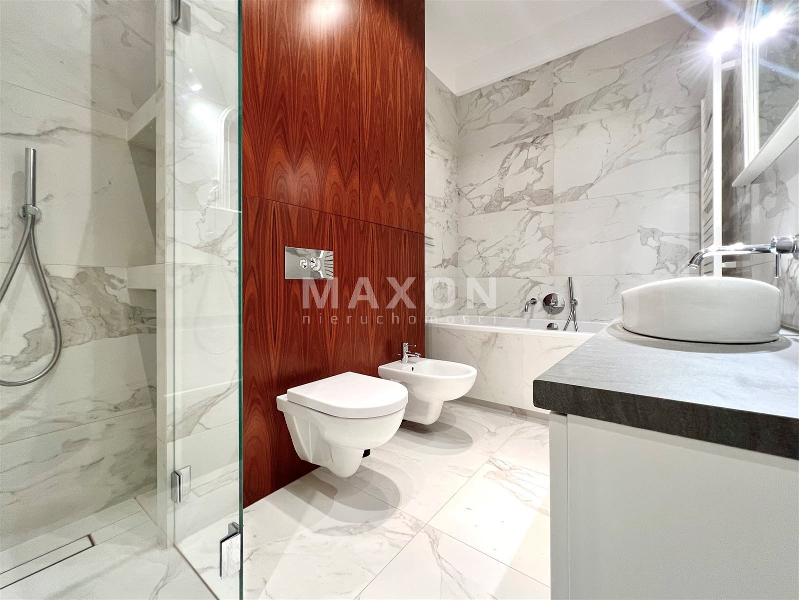 - Łazienka – wykończona eleganckimi materiałami, wyposażona zarówno w wannę, jak i kabinę prysznicową.