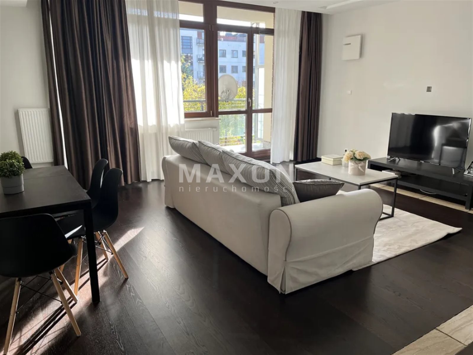 Na wynajem 3-pokojowy apartament w Miasteczku Wilanów o powierzchni 84 m2, z pięknym widokiem z salonu na zielone patio.