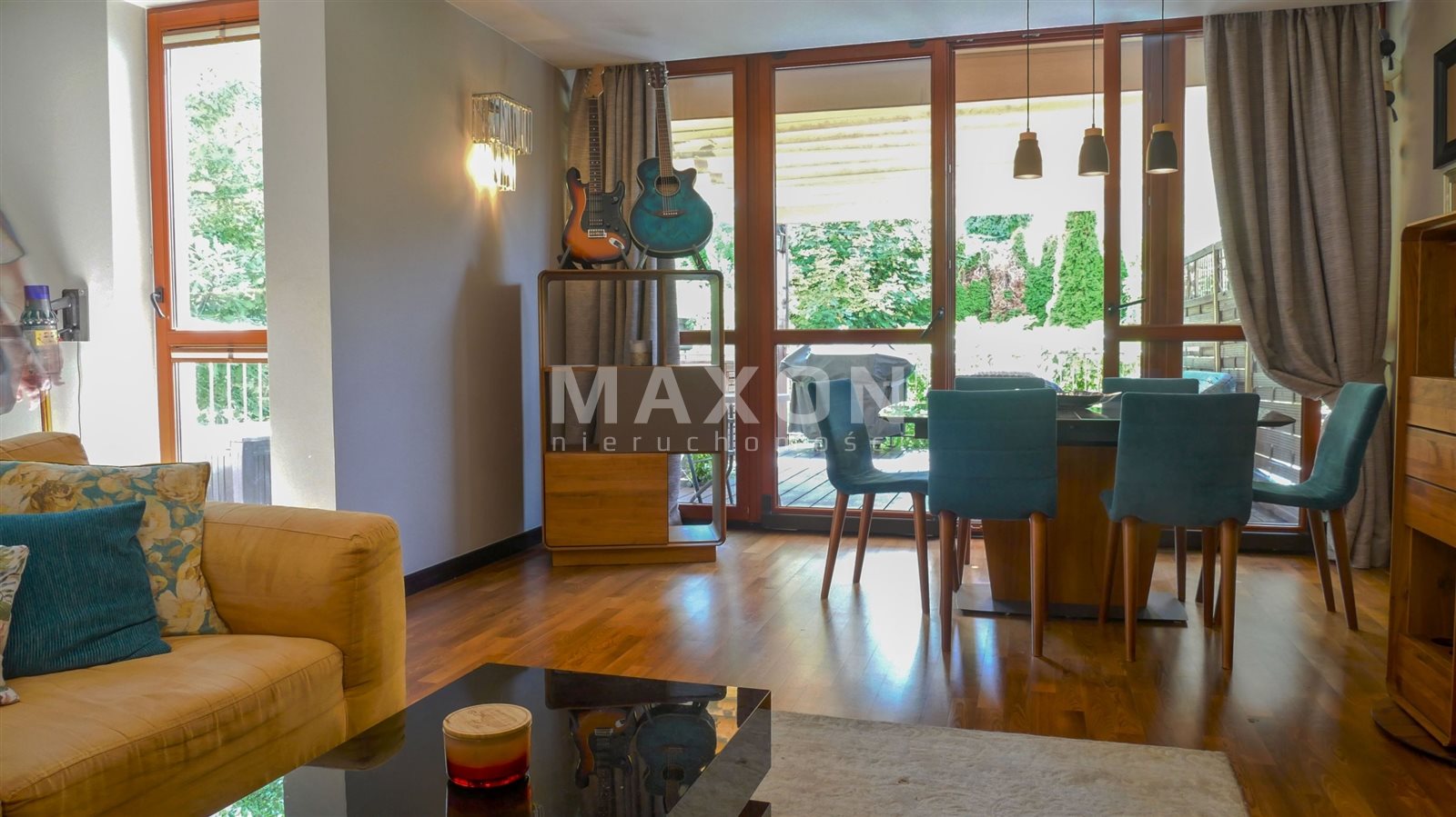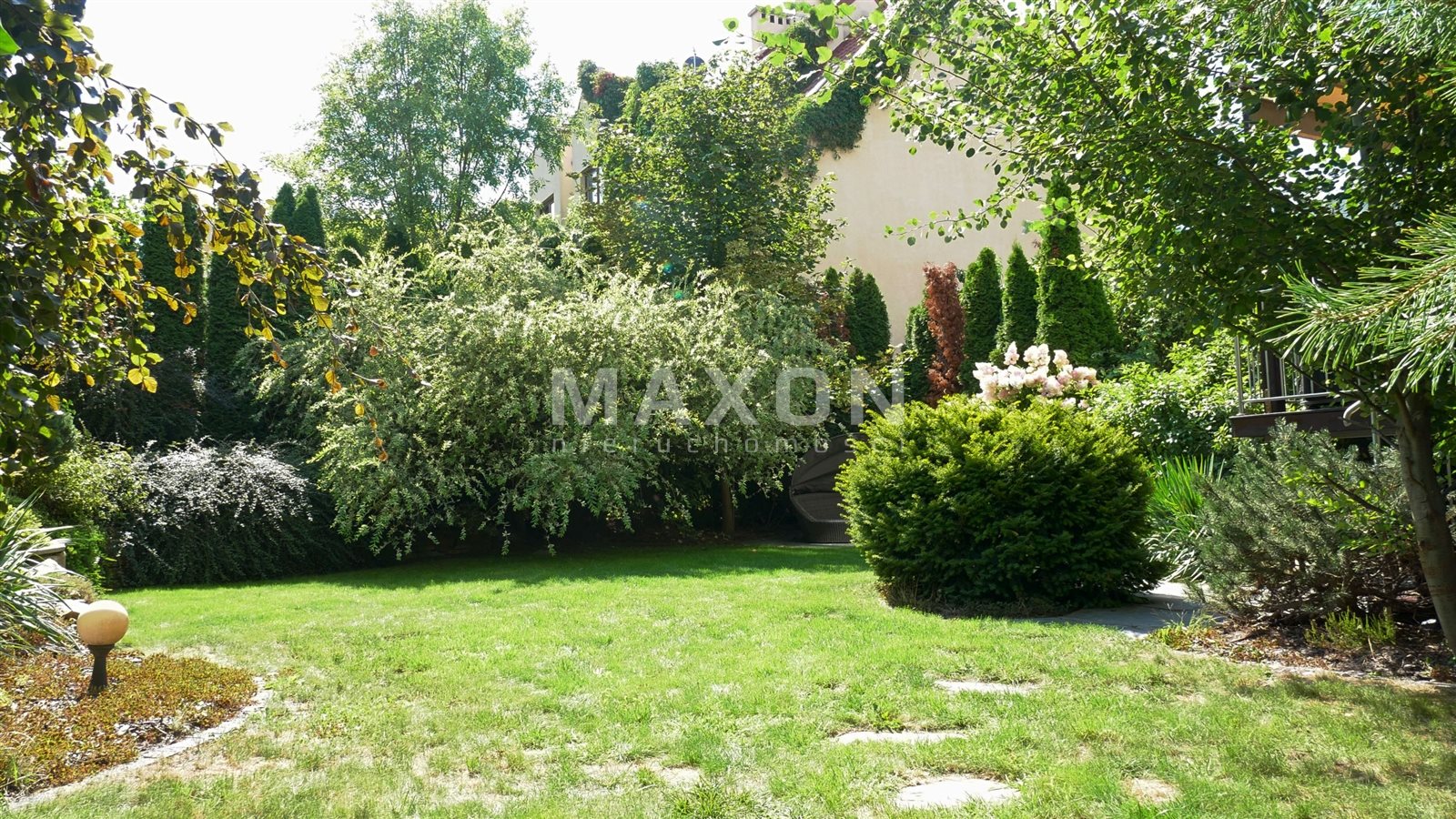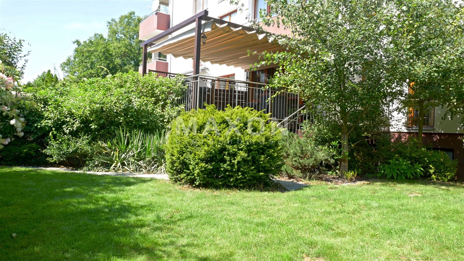 Apartament mieści się w kameralnym budynku w otoczeniu zabudowy jednorodzinnej i szeregowej. Jego największym atutem jest prywatny, pięknie zaaranżowany ogród o powierzchni 300 m², całkowicie niewidoczny z innych budynków, zapewniający ciszę i intymność. Do dyspozycji taras (30 m²) po świeżym odświeżeniu, wyposażony w komplet mebli rattanowych, luksusowy grill oraz zwijany dach. Ogród jest łatwy w utrzymaniu dzięki automatycznemu systemowi nawadniania (5 sekcji) i posiada liczne nasadzenia. Na terenie znajduje się też drewniany domek na narzędzia i sprzęt rekreacyjny. Bardzo cicha okolica sprawia, że to idealne miejsce do relaksu po pracy.Lokalizacja