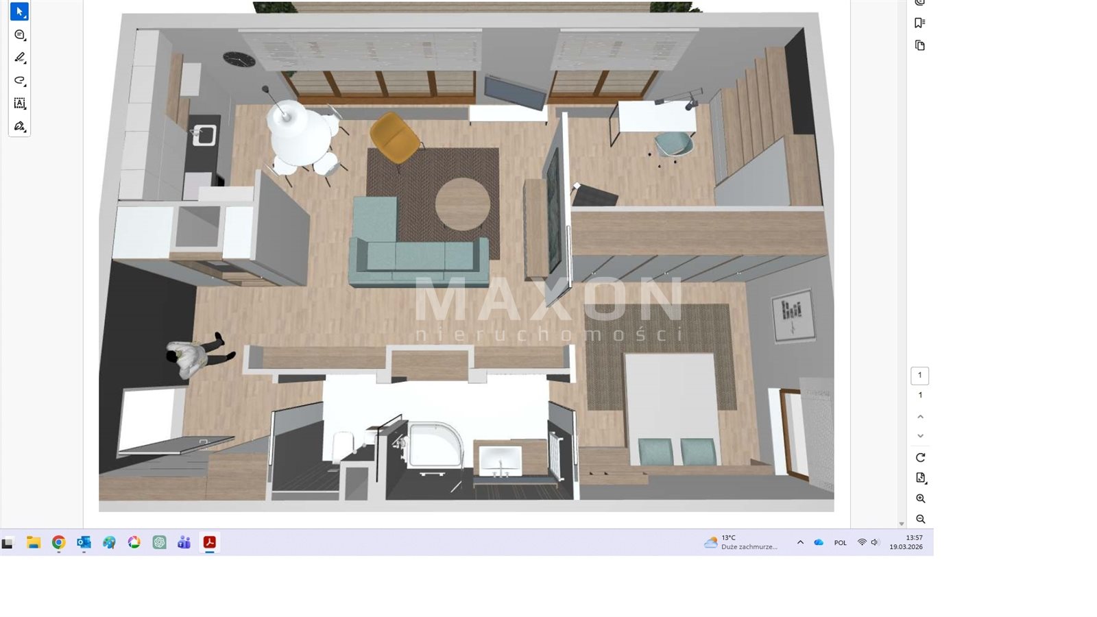 Składa się z przestronnego salonu połączonego z nowoczesnym aneksem kuchennym, z którego prowadzi wejście do oddzielnego gabinetu – idealnego do pracy zdalnej lub jako dodatkowy pokój.
