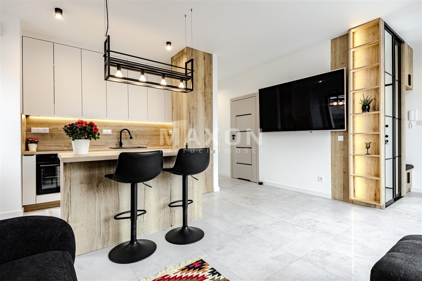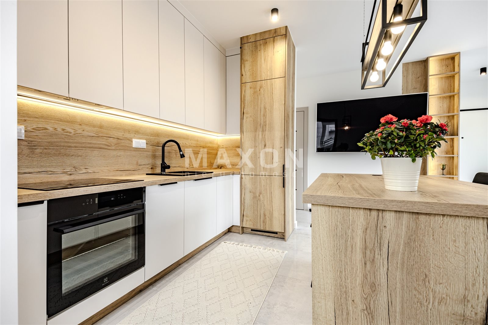 - Aneks kuchenny w pełni wyposażony w sprzęt AGD (płyta grzewcza, piekarnik, mikrofalówka, zmywarka, lodówko-zamrażarka), zabudowa meblowa wykonana na wymiar,
