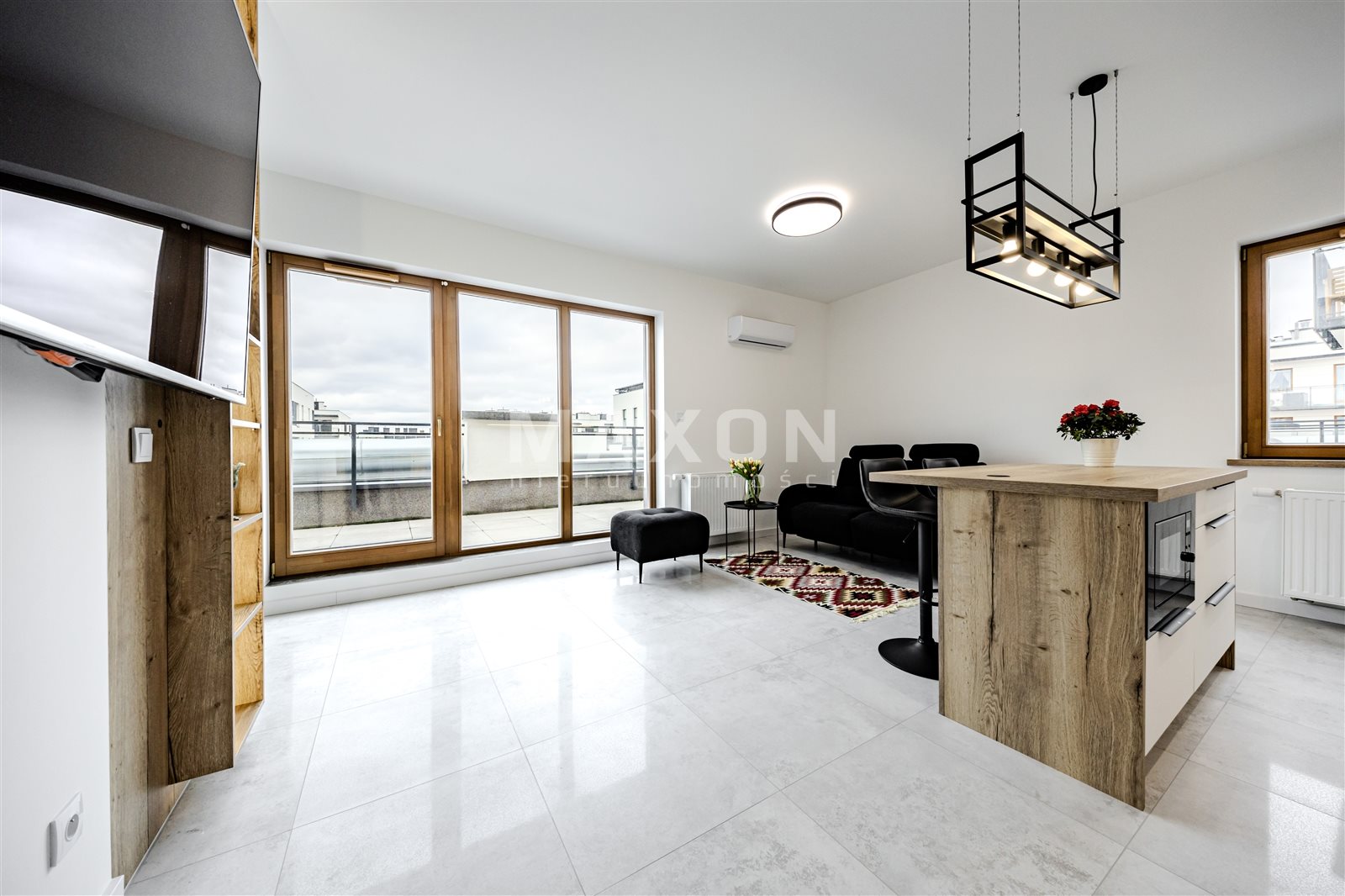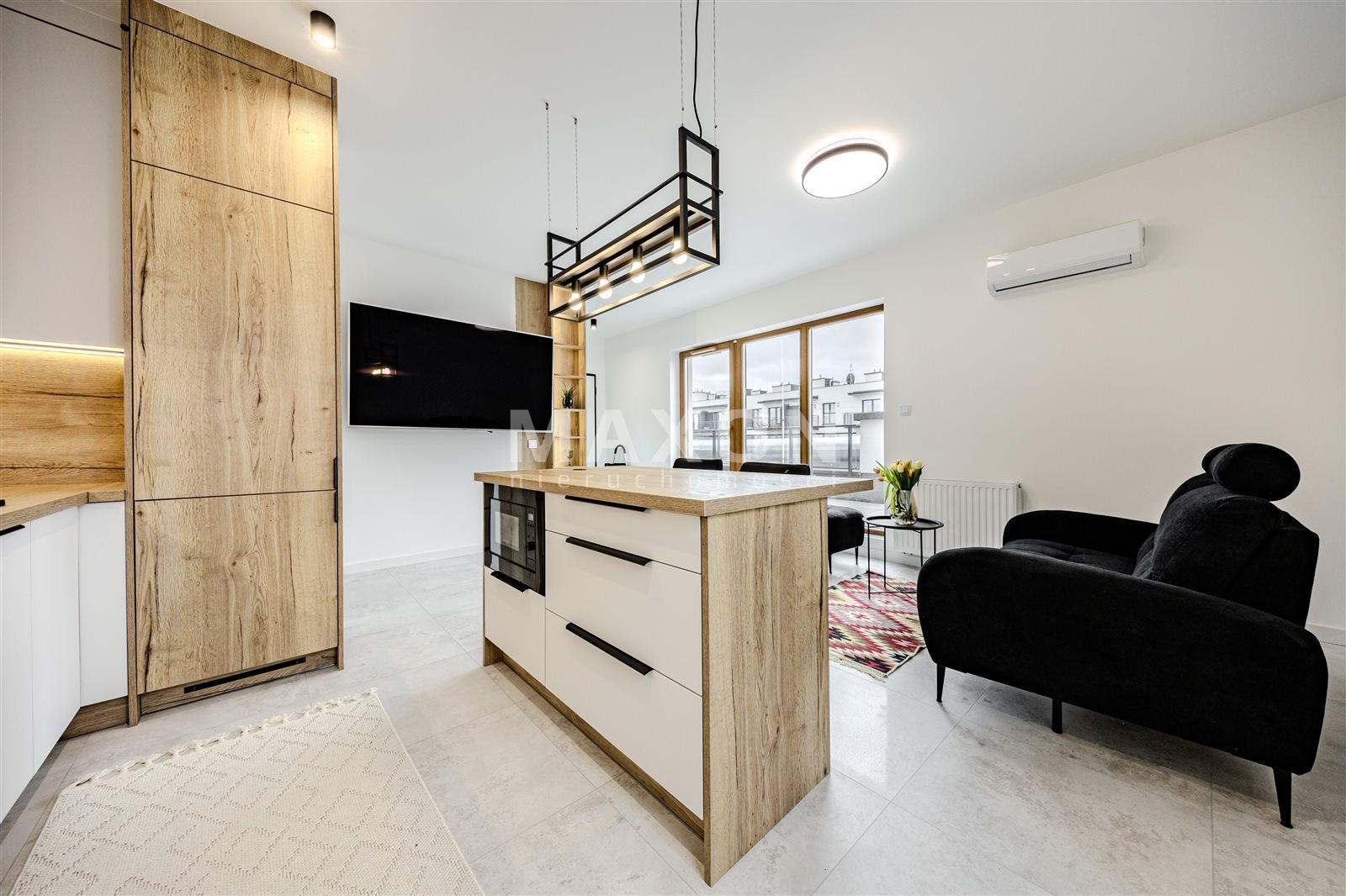 - Salon z wygodną sofą z funkcją relaksu, dużym telewizorem, klimatyzacją oraz wyjściem na przestronny taras,