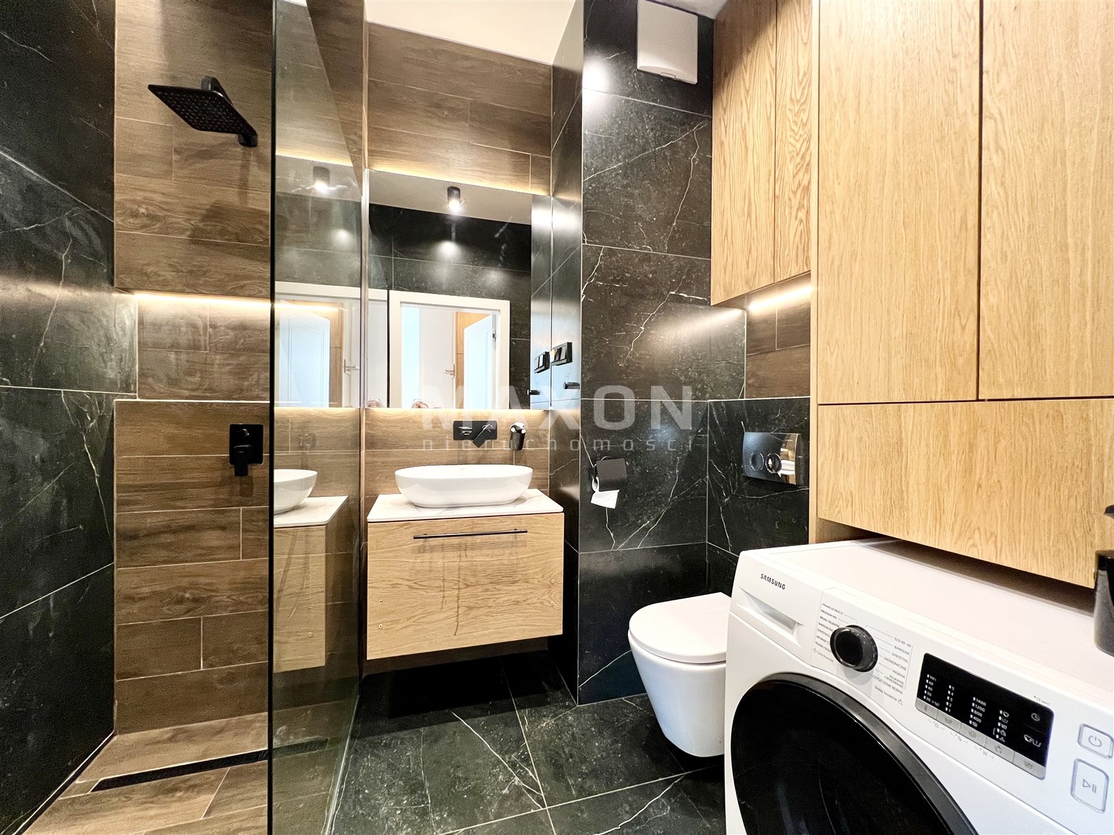 Łazienka z prysznicem, pralko-suszarką i sporą ilością szafek w zabudowie.