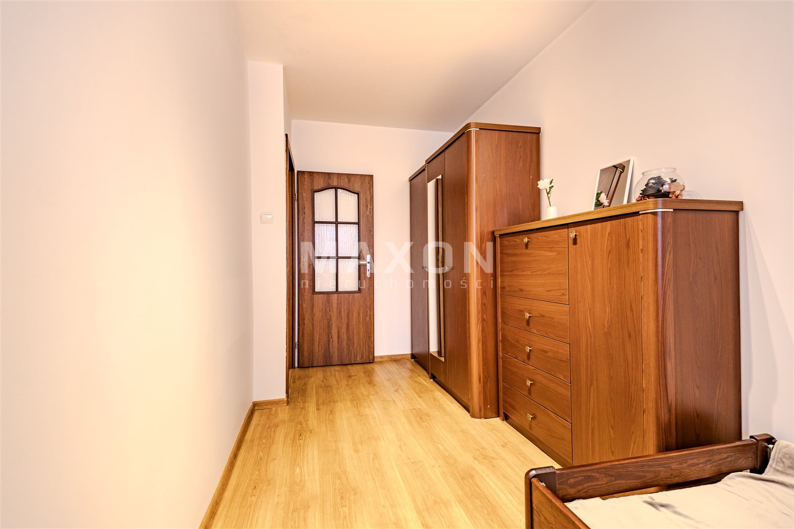 Sypialnia wyposażona jest w komodę, szafę stojącą z lustrem i łóżko sypialniane 90 cm, (na życzenie najemcy możliwość wstawienia łóżka o większych wymiarach). W korytarzu znajdują się dwie zabudowane, pojemne szafy.