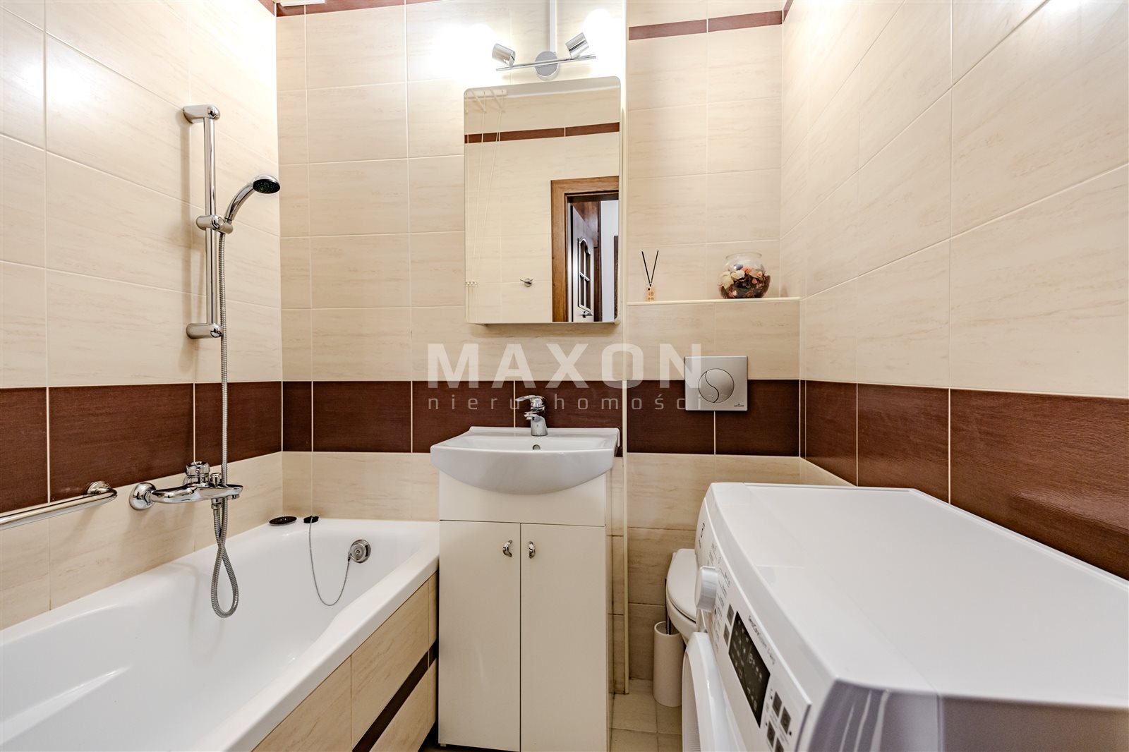 W łazience znajdują się wanna, umywalka, toaleta, pralka oraz grzejnik.